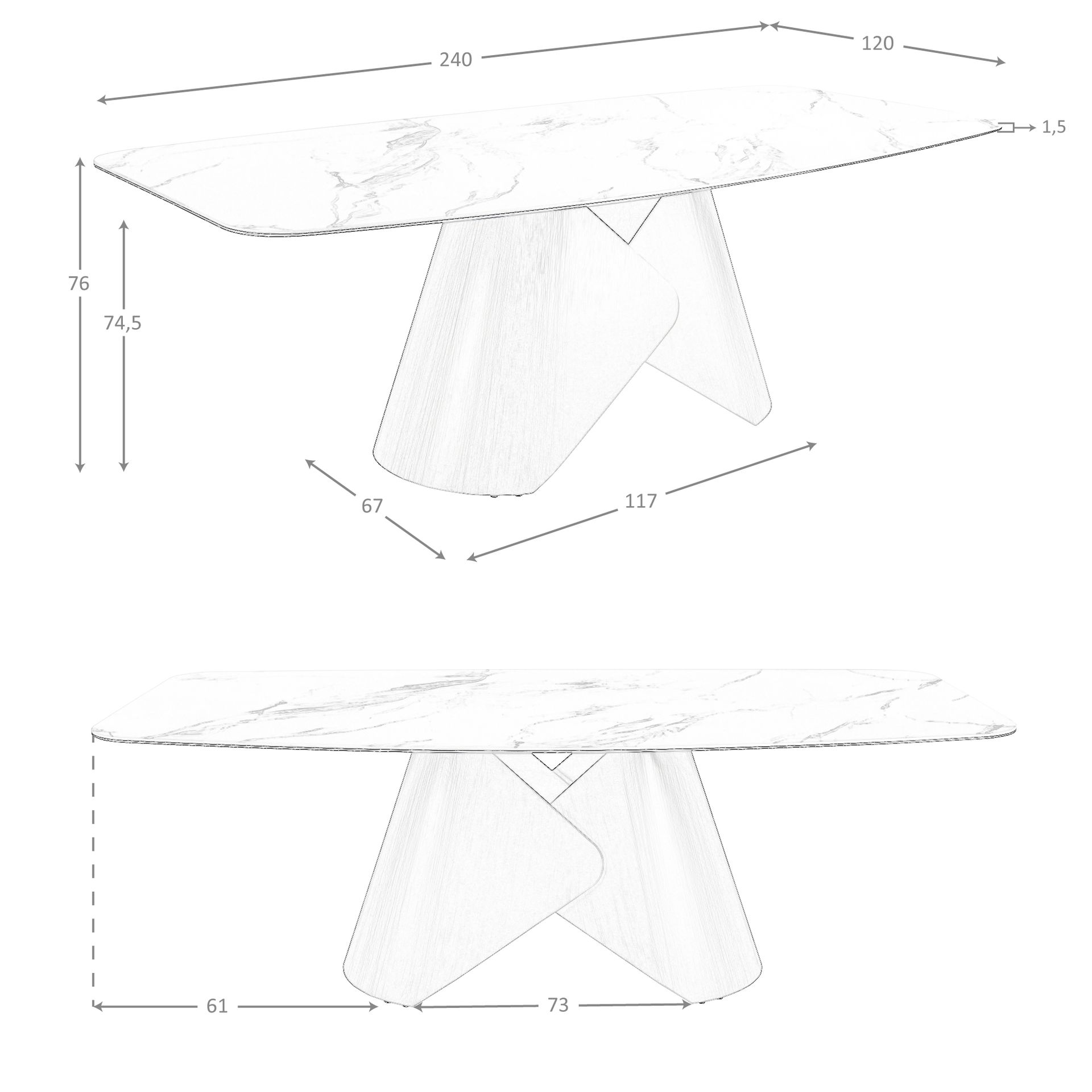 Mesa comedor ovalada barril mármol porcelánico y acero color bronce modelo 1172 Angel Cerdá S.L.Mesa comedor ovalada barril de diseño moderno con tapa fija de mármol porcelánico blanco con vetas en tonalidades grises y marrones en acabado brillo. Sus originales patas de acero inoxidable color bronce son elementos claves a destacar de su diseño.Medidas del producto: 240 x 120 x 76 cm.- Su tapa de mármol porcelánico es resistente y duradera, ofreciendo además un toque de vanguardia y elegancia al ambiente. – La originalidad de su estructura aúna modernidad y robustez, así como la mayor comodidad para sus comensales. – El perfil de la tapa pulido de esta mesa de comedor ofrece un acabado de alta calidad, siendo además, sinónimo de comodidad y elegancia. – Si busca la mesa comedor perfecta para tu hogar, esta es una opción ideal para aunar el toque moderno y de vanguardia que necesitas, con la mayor calidad y funcionalidad. – Apta para un máximo de 10 comensales.