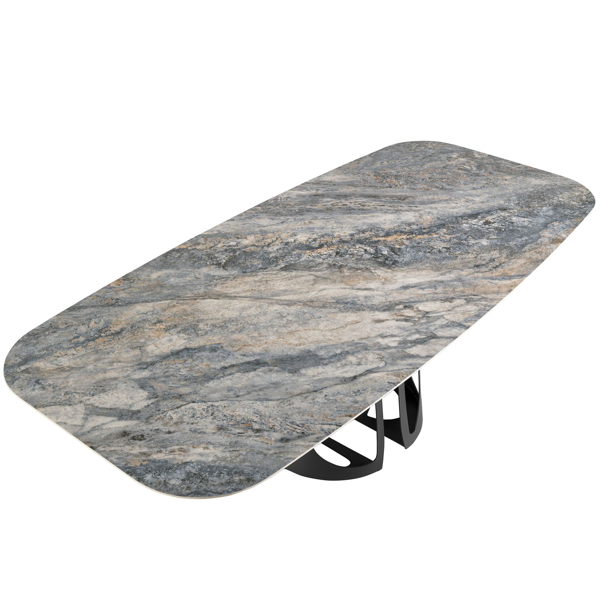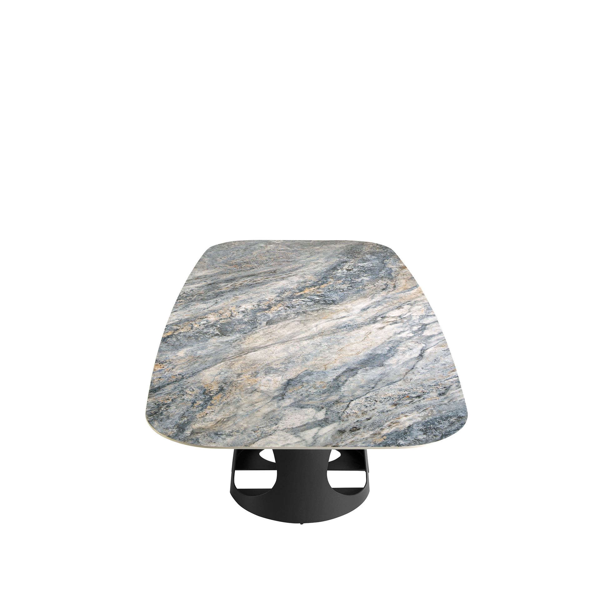 Mesa comedor ovalada barril mármol porcelánico y acero negro modelo 1136 Angel Cerdá S.L.Mesa comedor ovalada barril de diseño moderno con tapa fija de mármol porcelánico azul con vetas en tonalidades grises y marrones en acabado brillo. Sus originales patas de acero inoxidable pintado en epoxi negro son elementos claves a destacar de su diseño.Medidas del producto: Ø238 x 110 x 76 cm.- Su tapa de mármol porcelánico es resistente y duradera, ofreciendo además un toque de vanguardia y elegancia al ambiente. – La originalidad de su estructura aúna modernidad y robustez, así como la mayor comodidad para sus comensales. – El perfil de la tapa biselado de esta mesa de comedor ofrece la máxima calidad en acabado y comodidad. – Si busca la mesa comedor perfecta para tu hogar, esta es una opción ideal para aunar el toque moderno y de vanguardia que necesitas, con la mayor calidad y funcionalidad. – Apta para un máximo de 10 comensales.
