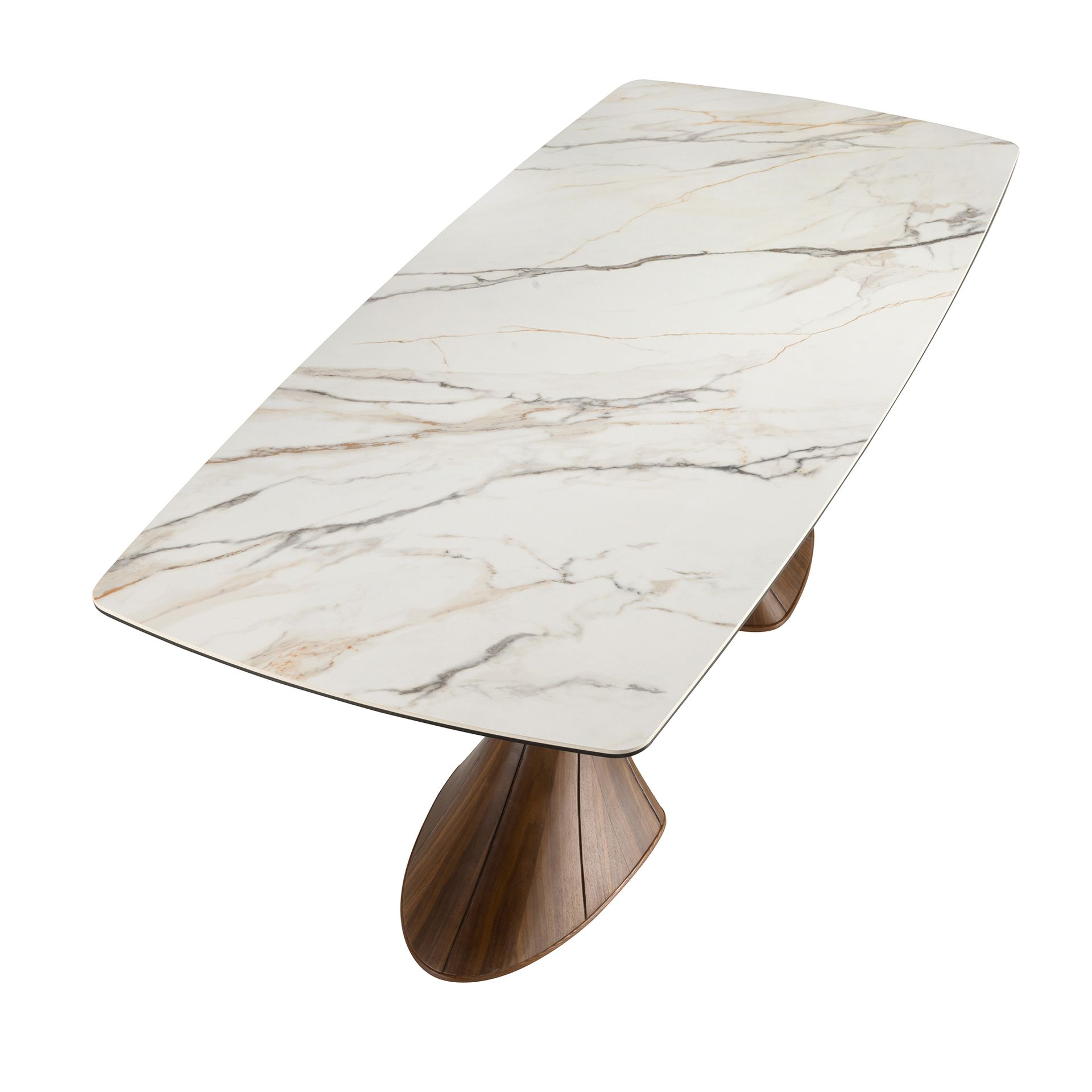 Mesa comedor ovalada barril mármol porcelánico y nogal