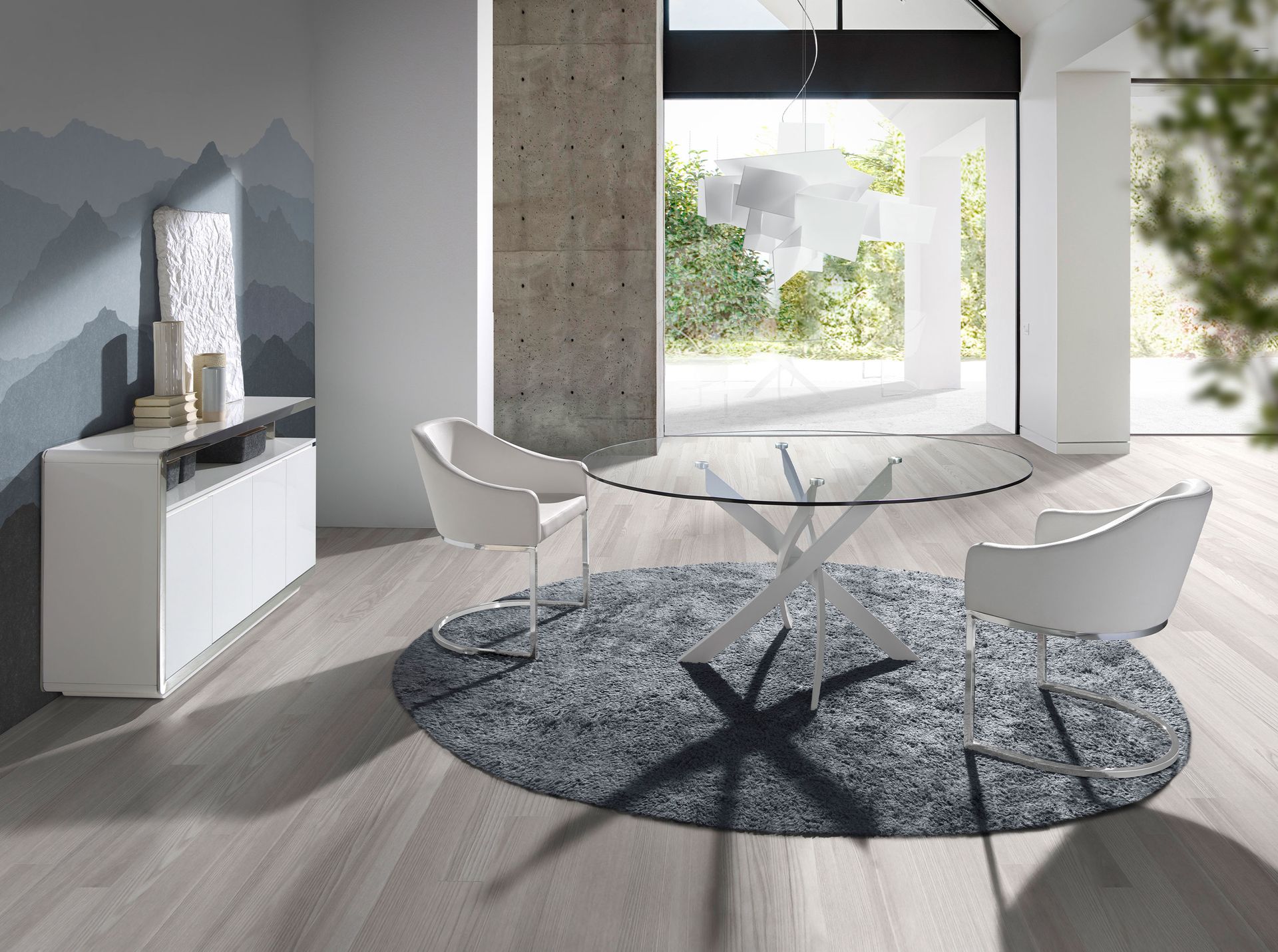 Mesa comedor redonda cristal templado y acero blanco modelo 1138-Ø120 Angel Cerdá S.L.Mesa comedor redonda de diseño moderno con tapa fija de cristal templado. Sus originales patas de acero pintado en color blanco son elementos claves a destacar de su diseño.Medidas del producto: Ø120 x 75 cm.- Su tapa de cristal templado de 12 mm de espesor es resistente, duradera, y favorece la sensación de amplitud en el espacio. – La originalidad de sus patas aúnan el estilo más vanguardista de nuestra marca con la mayor calidad y comodidad para sus comensales. – El perfil de la tapa pulido de esta mesa de comedor ofrece un acabado de alta calidad, siendo además, sinónimo de comodidad y elegancia. – Si busca la mesa comedor perfecta para tu hogar, esta es una opción ideal para aunar el toque moderno y de vanguardia que necesitas, con la mayor calidad y funcionalidad. – Apta para un máximo de 4 comensales.