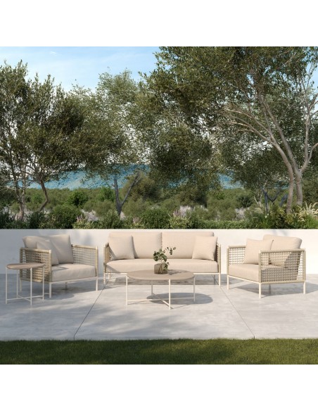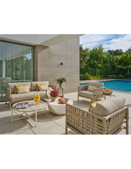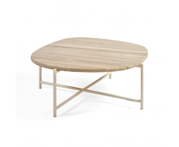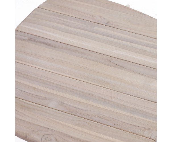 Mesa de centro para exterior con sobre de madera de teca envejecida y estructura sencilla de aluminio blanco. Mesa de centro para jardín o porche ideal para tu zona de relax o descanso al aire libre con estilo moderno y minimalista. Disponible también en mesa auxiliar. Combínalas para hacer un set de exterior. Se venden por separado.