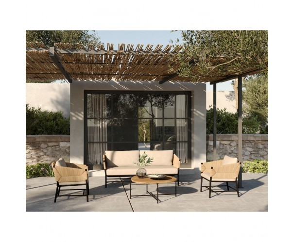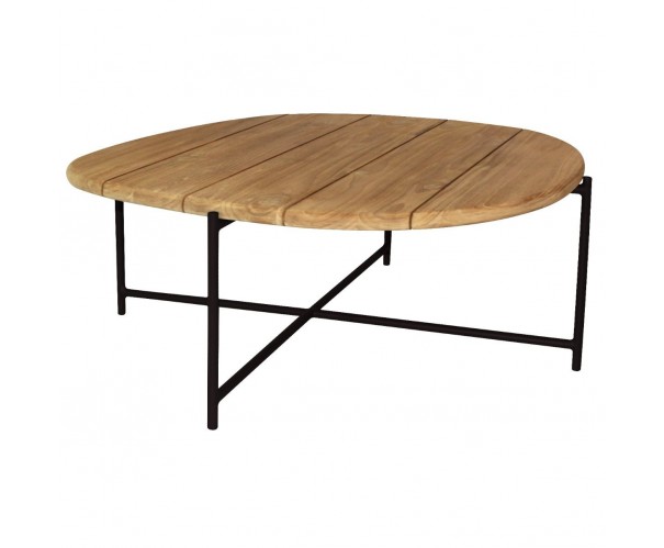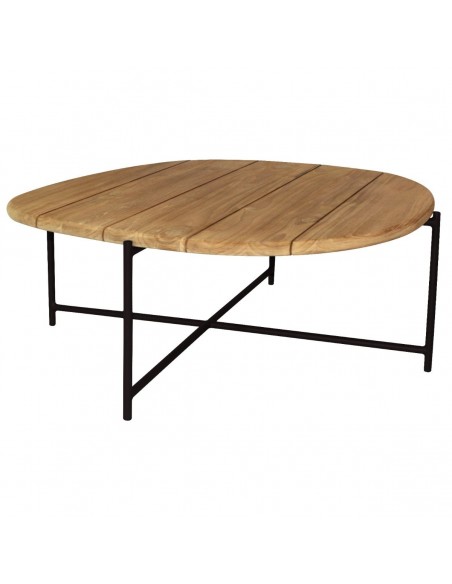 Mesa de centro para exterior con sobre de madera de teca y estructura sencilla de metal oscuro. Mesa de centro para jardín o porche ideal para tu zona de relax o descanso al aire libre con estilo moderno y minimalista.