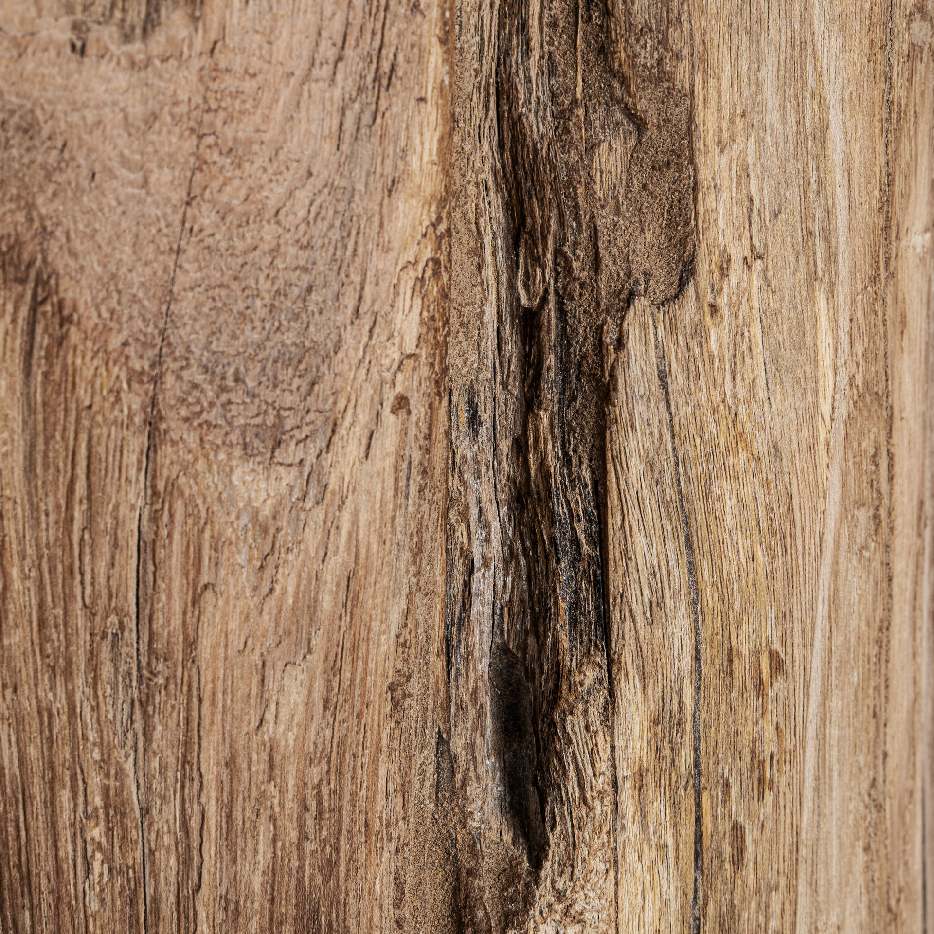 Mesa de centro Erloy de estilo rústico fabricado en madera de teka reciclada en color marrón claro con acabado envejecido.