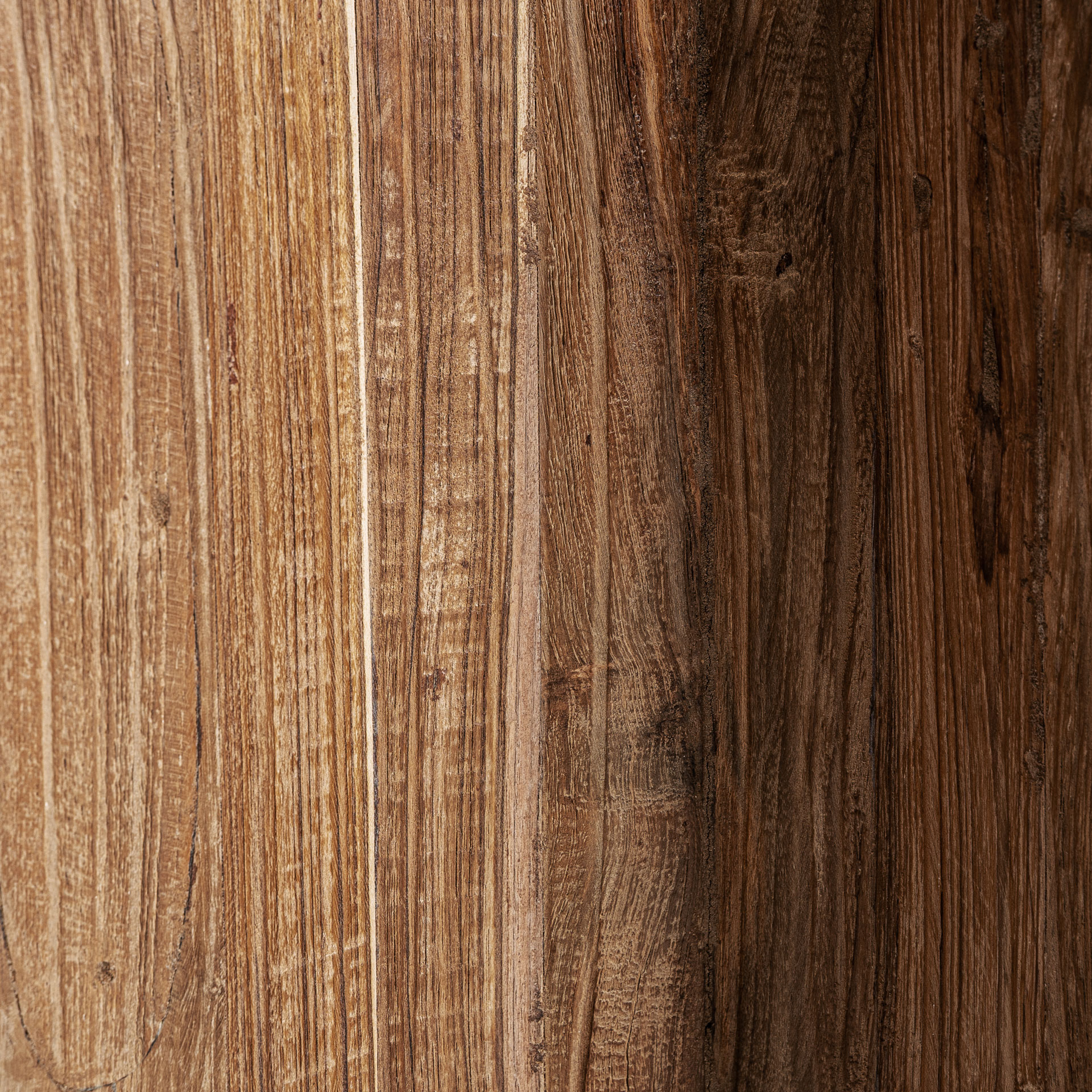 Mesa de centro Erloy de estilo rústico fabricado en madera de teka reciclada en color marrón claro con acabado envejecido.