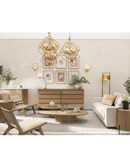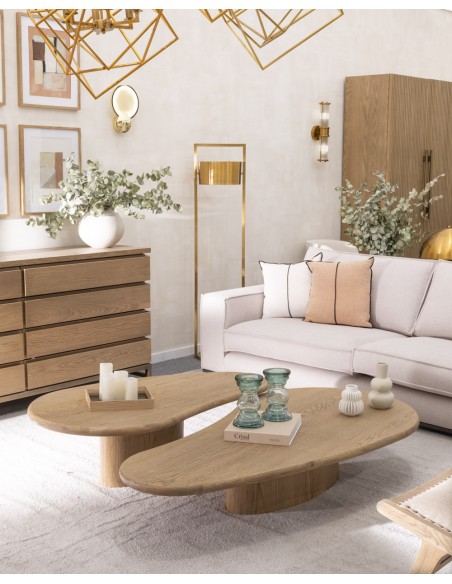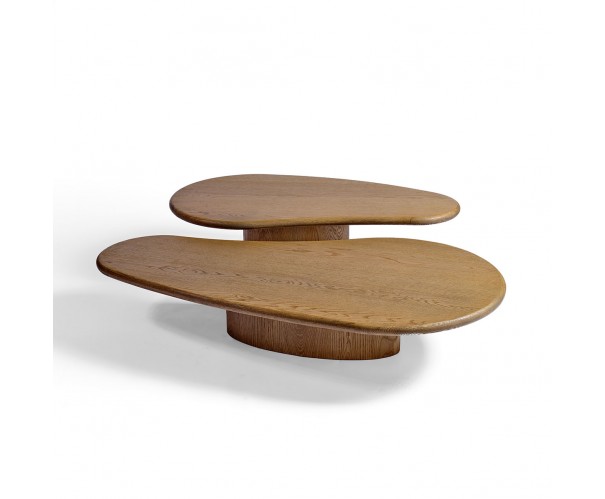 Mesa de centro de madera de roble natural con forma irregular y pata central. Diseño con líneas curvas sofisticado y elegante. Se puede usar en set con otros modelos y medidas. Se venden por separado.