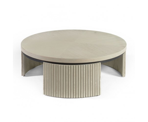 Mesa de centro redonda acabada en roble blanco grisáceo y metal negro. Original mesa con patas de madera alistonada de diseño moder y líneas curvas que aportan armonía a la estancia. También disponible en mesa auxiliar (SERENA-1). Posibilidad de hacer set.