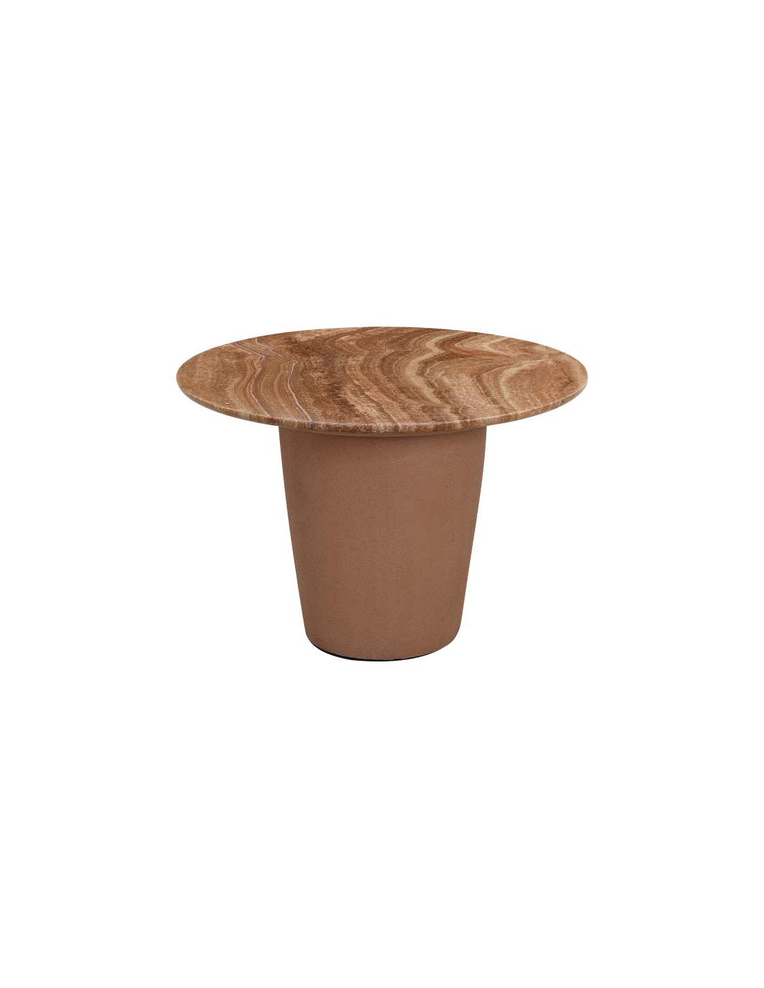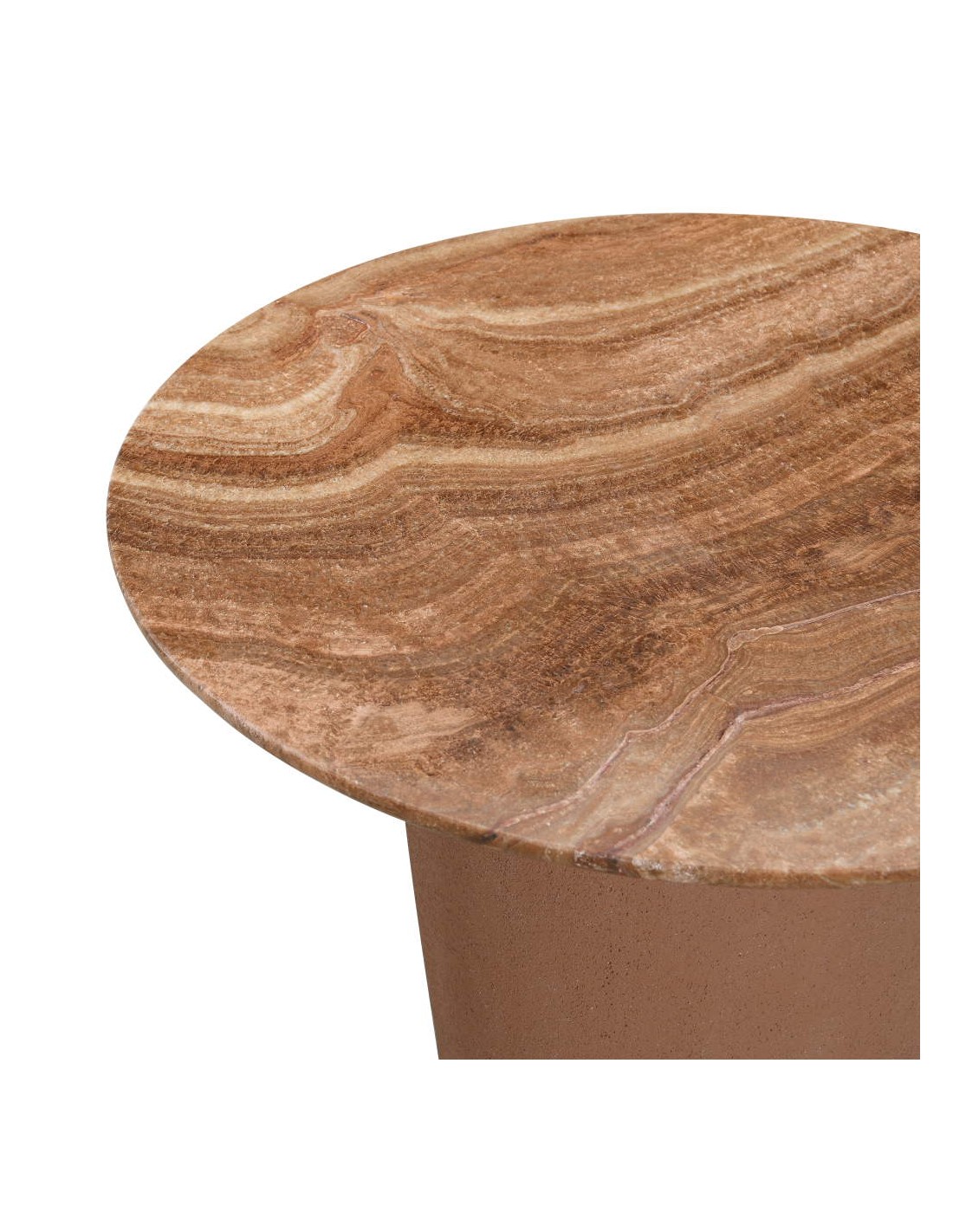 Mesa de centro redonda de microcemento y mármol anaranjado.