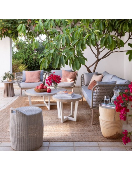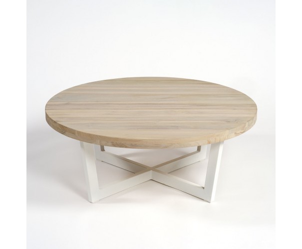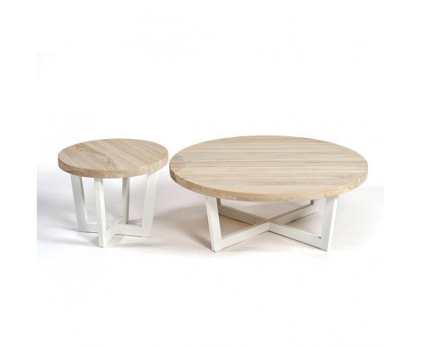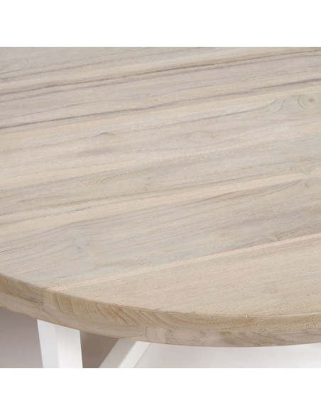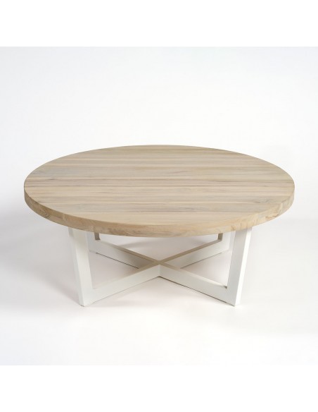 Mesa de centro redonda con tapa de madera de teca envejecida blanqueada y pata de aluminio en color gris claro. Combinación ideal con nuestros modelos de mesas de comedor como JOEL o JOEL-S y auxiliares de teca envejecida blanqueada, como el modelo ILIA-S. Apta para uso exterior.
