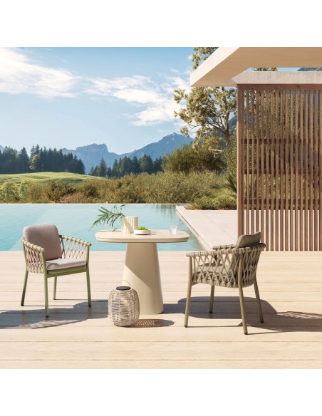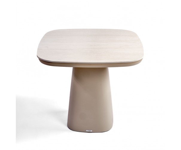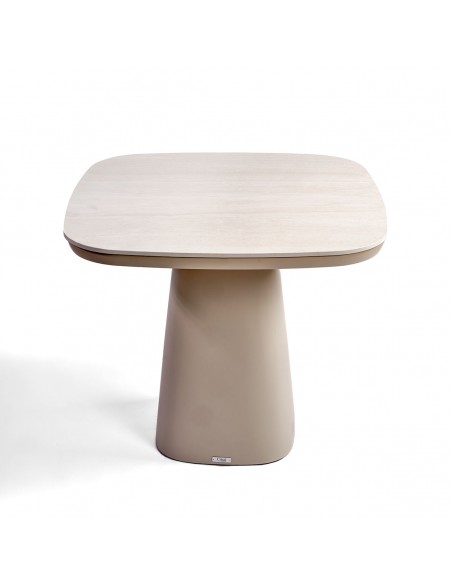 Mesa de comedor para exterior cuadrada con pata color arena y sobre de cerámica blanca. Un diseño minimalista sencillo con toque sofisticado y elegante. Es perfecta para porches o zonas de exterior para crear ambientes en armonía para momentos de descanso al aire libre.