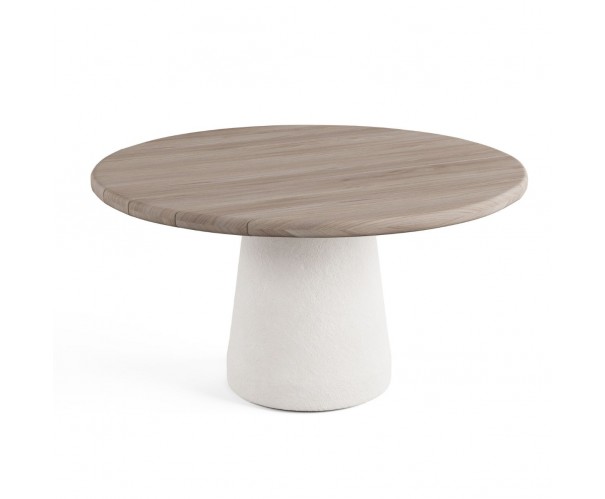 Mesa de comedor de madera de teca grisácea y base en efecto cemento blanco.