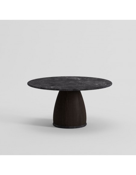 Mesa redonda de comedor con pata en fresno oscuro combinada con la piedra a tono. Elegancia y versatílidad en una sola pieza. Ideal para aportar un toque de lujo y elegancia a tu comedor.