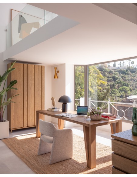Mesa de comedor rectangular con acabado en roble color natural. Presenta de apoyo 4 patas, una en cada esquina, dejando los laterales libres para las sillas. La construcción de sus patas es lo que aporta el toque característico, dejando un hueco en forma de triángulo dentro de cada una de ellas.