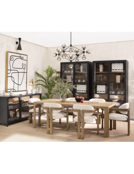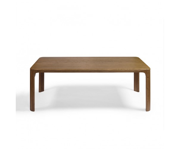 Mesa de comedor rectangular acabada en madera de roble natural. Diseño de mesa de comedor grande con líneas rectas y depuradas y esquinas redondeadas.