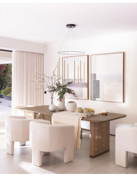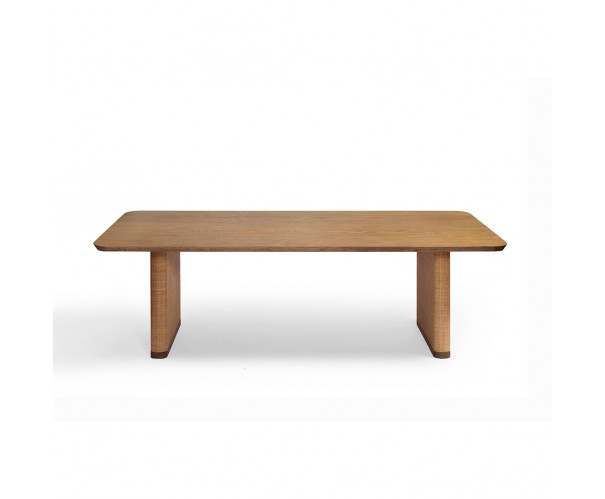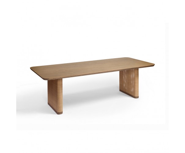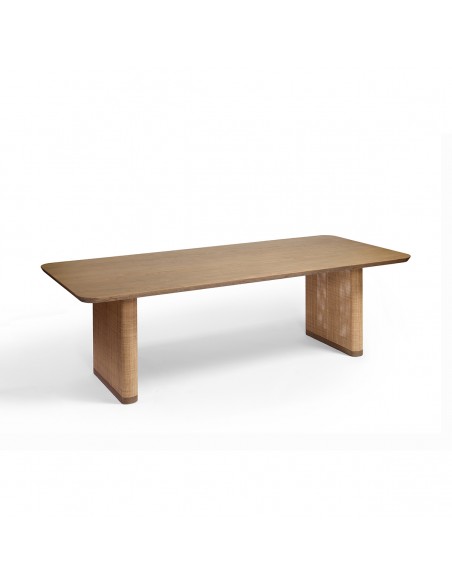 Mesa de comedor rectangular acabada en madera de roble en tono claro. Esta original mesa de comedor cuenta con dos patas con ratán natural que aportan un toque muy especial muy cálido. Es ideal para ambientes de estilo mediterráneo, naturales o incluso aquellos con un toque retro.