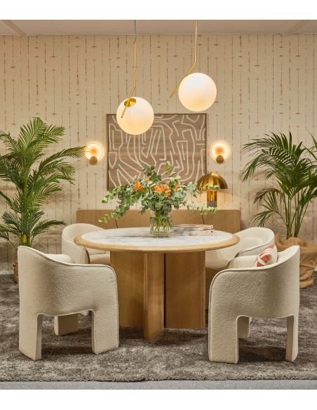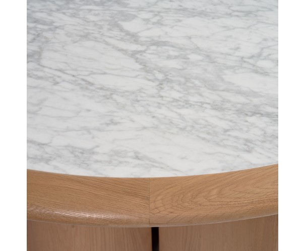 Esta mesa de comedor redonda con estructura de madera de roble claro y sobre de mármol es el equilibrio perfecto entre elegancia y funcionalidad. Su pata central, diseñada para ofrecer comodidad y estabilidad, destaca por su sencillez y sofisticación. Perfecta para decoradores e interioristas que buscan una mesa versátil y de alta calidad, ideal para transformar comedores en ambientes únicos y llenos de estilo. Diseño sofisticado y moderno, sin renunciar a la comodidad.