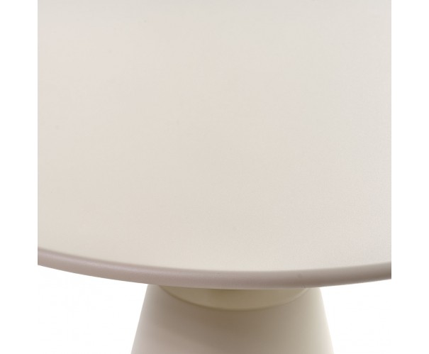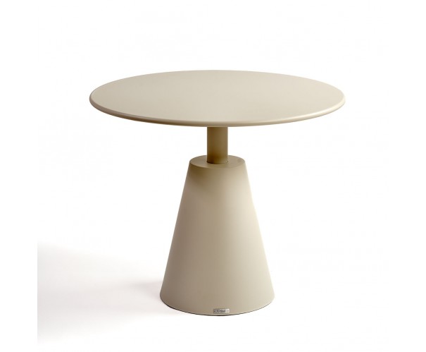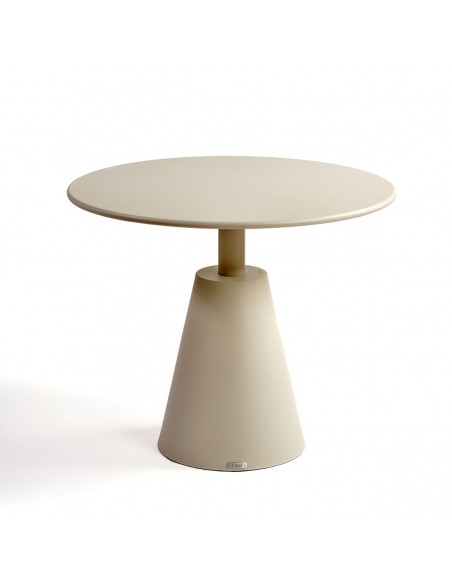 Mesa de comedor redonda con pata central cónica color beige crudo. Un mesa de comedor redonda apta para exterior para crear el ambiente perfecto para tu momento de relax al aire libre. Una mesa de exterior fabricada en aluminio, de estilo moderno y minimalista, sencilla a la vez que elegante que será perfecta para tu pequeña terraza, balcón o jardín. Su pata más ancha en la base le aporta estabilidad y diseño original.
