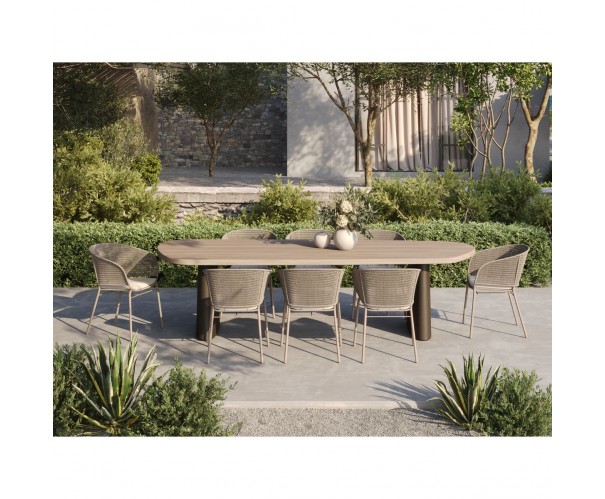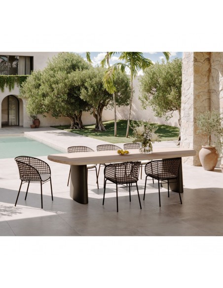 Mesa de comedor con un sofisticado sobre de teca envejecida que aporta calidez y carácter, y patas de fibra de vidrio oscura que garantizan durabilidad y estabilidad, esta mesa se convierte en el centro perfecto para sus reuniones al aire libre. Es ideal para disfrutar de comidas al fresco, cenas con amigos o momentos de relajación en su terraza o jardín. Añada un toque de distinción y estilo a su exterior con esta exquisita mesa que combina funcionalidad y diseño elegante.