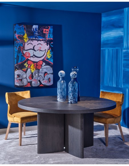 Esta mesa de comedor redonda con pata central en acabado roble color black-brown es una pieza única que combina elegancia y sofisticación. Perfecta para quienes buscan incorporar materiales naturales y acabados artesanales en sus proyectos, su diseño versátil se adapta con facilidad a cualquier estilo de decoración. Ideal para decoradores e interioristas que desean añadir un toque de lujo contemporáneo, esta mesa es una declaración de calidad, belleza y funcionalidad.