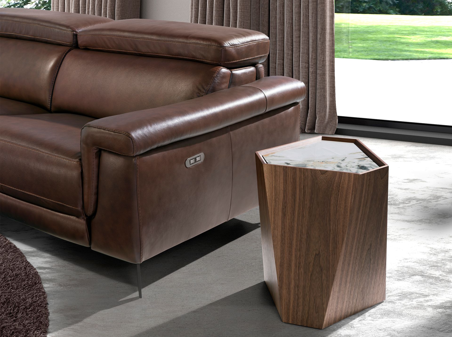 Mesa rincón triangular mármol porcelánico y nogal