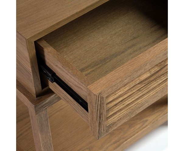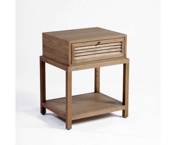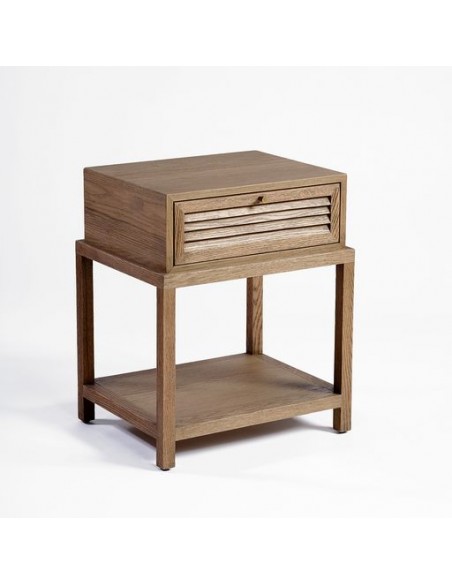 Mesita de noche con acabado en roble color natural. Tiene un cajón con el acabado frontal en persianilla y estructura completa de madera tanto la base como el sobre y el cajón.