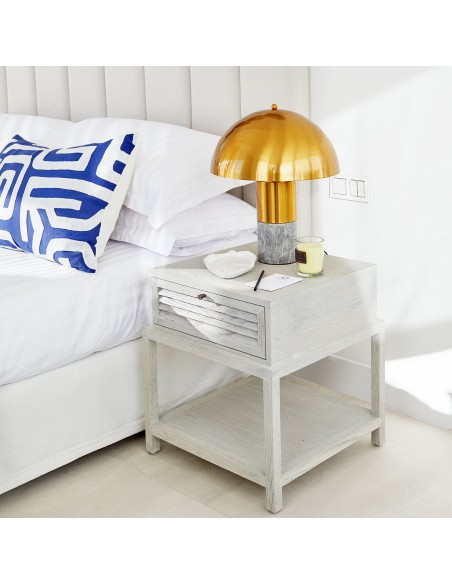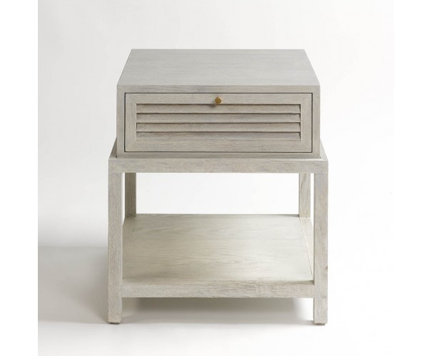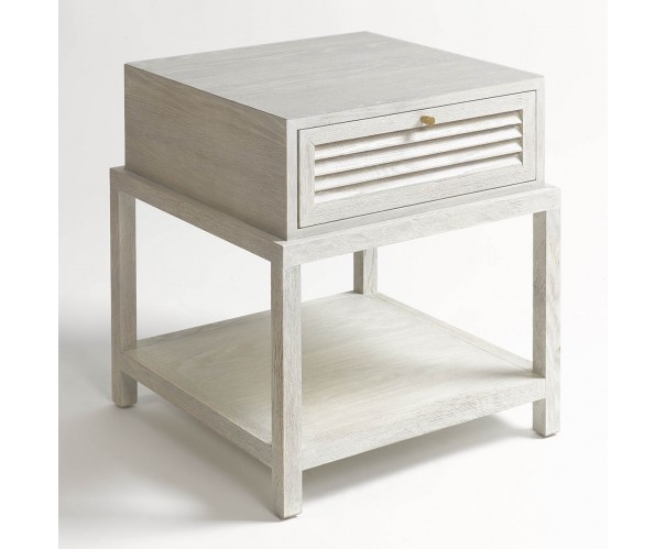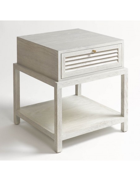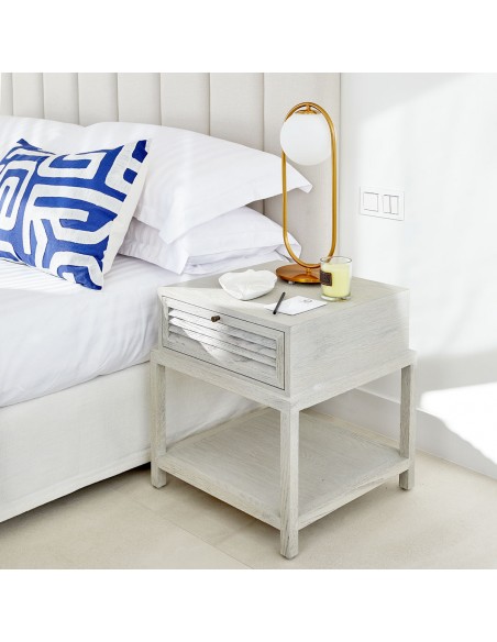 Mesita de noche con acabado en roble color claro blanco patinado. Tiene un cajón con el acabado frontal en persianilla y estructura completa de madera tanto la base como el sobre y el cajón.