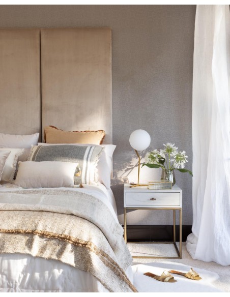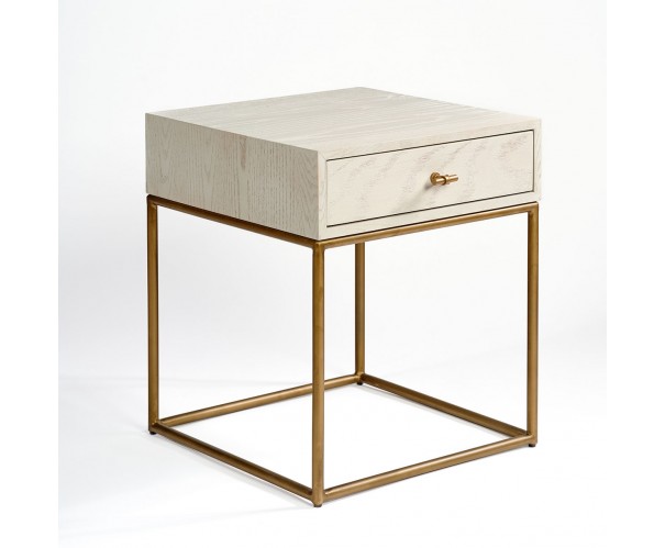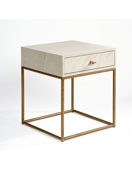 Mesita de noche acabada en madera de roble blanco grisáceo patinado. Estrucutra metálica en tubo redondo color dorado. Tirado en forma de T de diseño moderno para dar un toque actual y sofisticado a la pieza. Una mesita de noche con líneas rectas y aire contemporáneo.