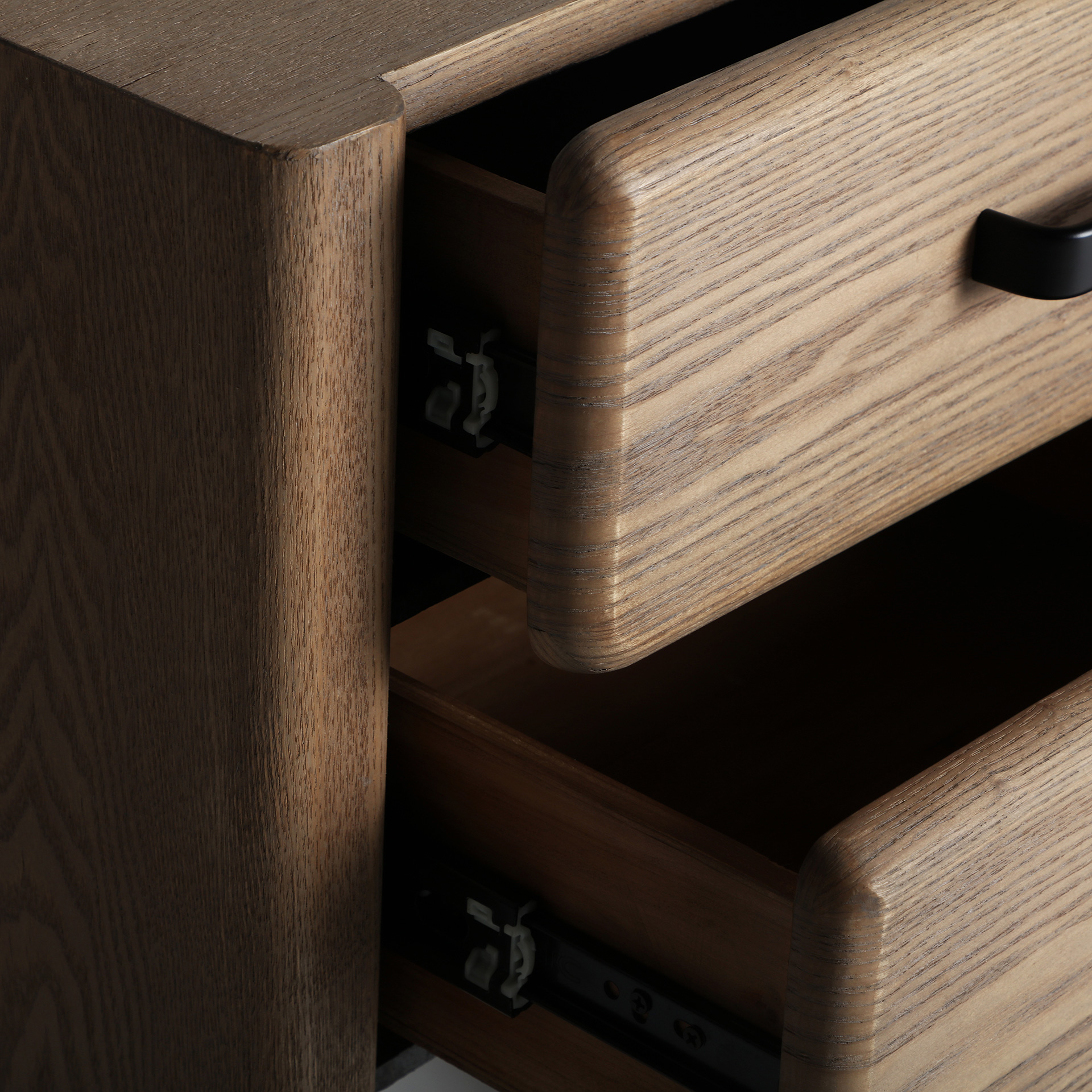 Mesita de noche Busk de estilo nórdico, fabricado en madera de fresno en color marrón claro, combinado con madera dm en color marrón y hierro en color negro.