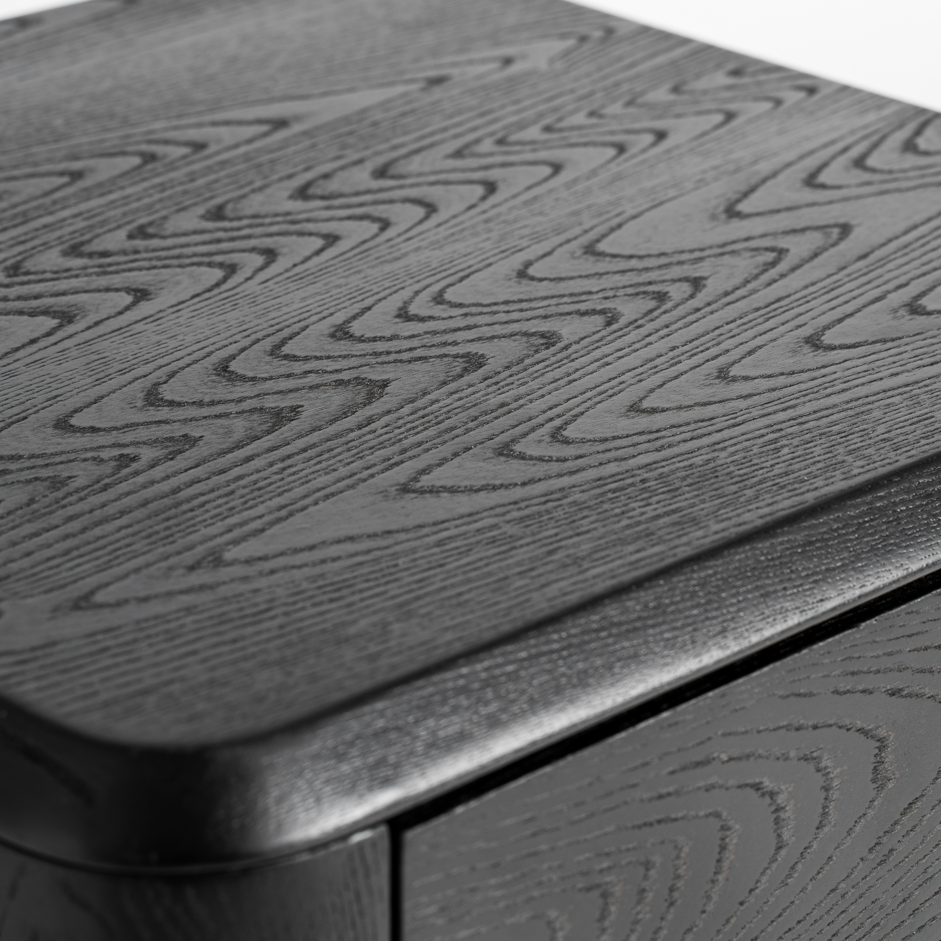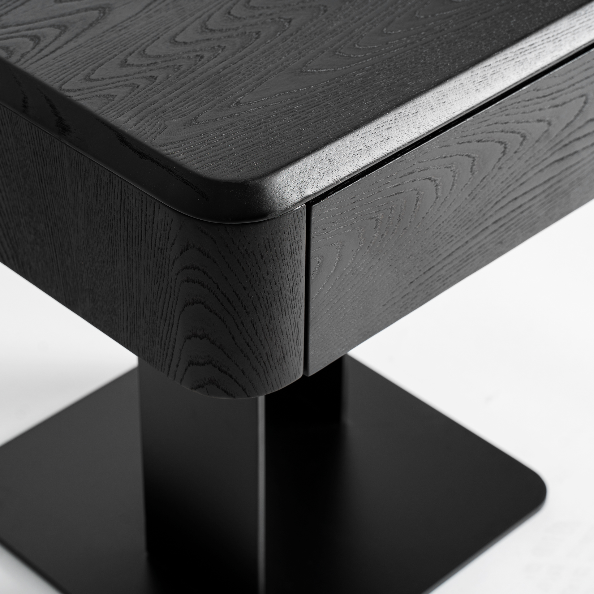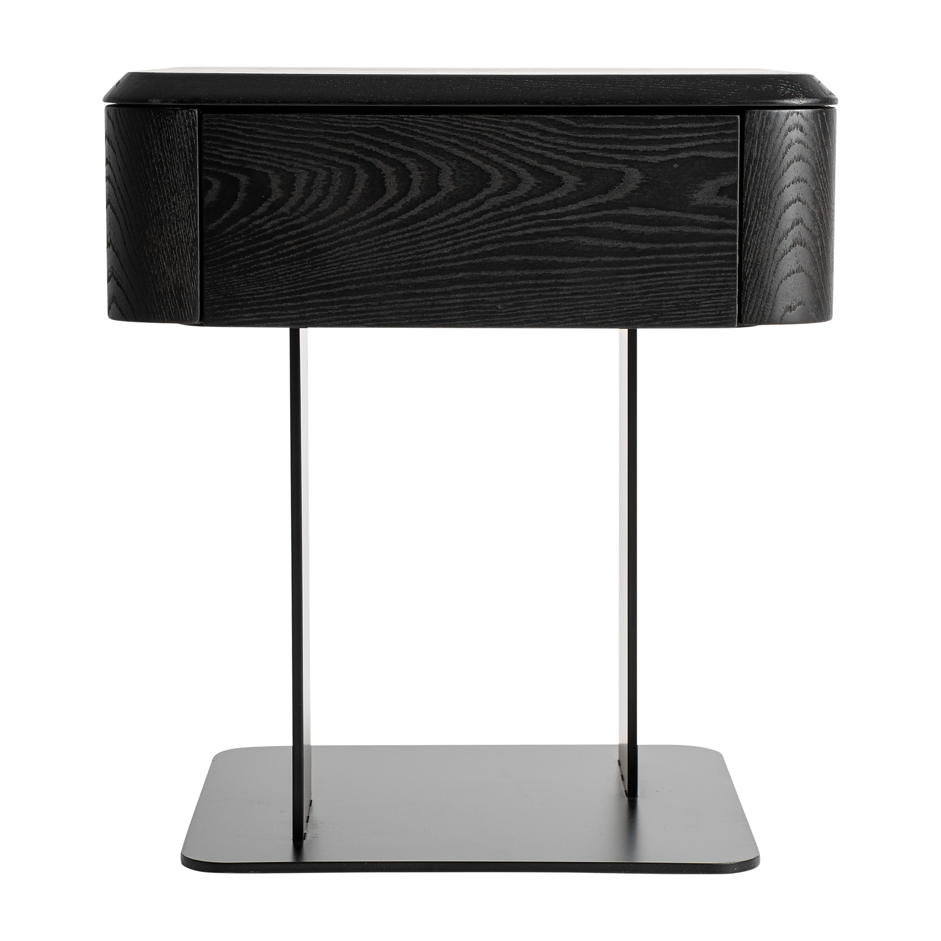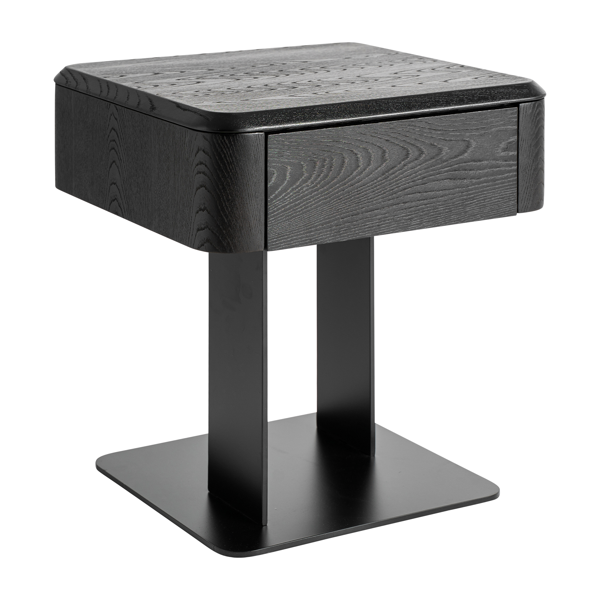 Mesita de noche Caiza de estilo contemporáneo fabricado en madera dm en color negro combinado con chapa de olmo en color negro y hierro en color negro.