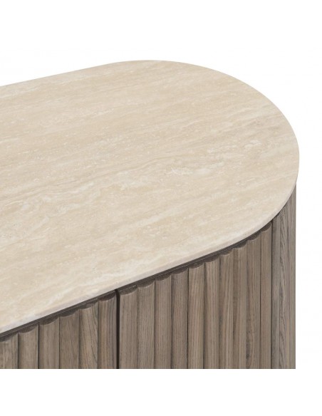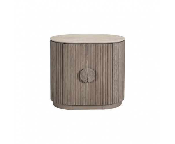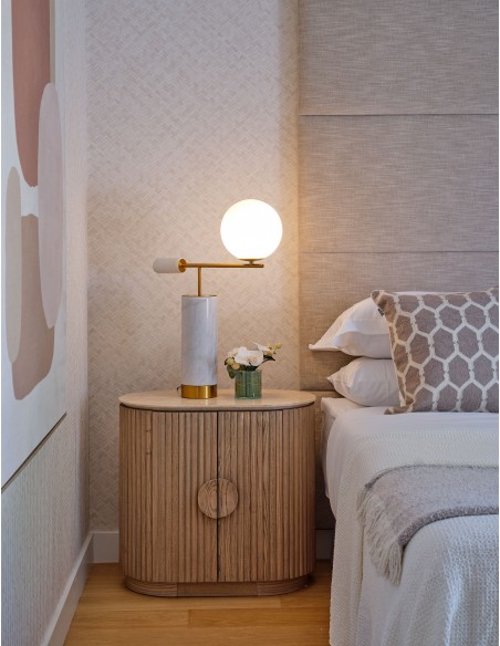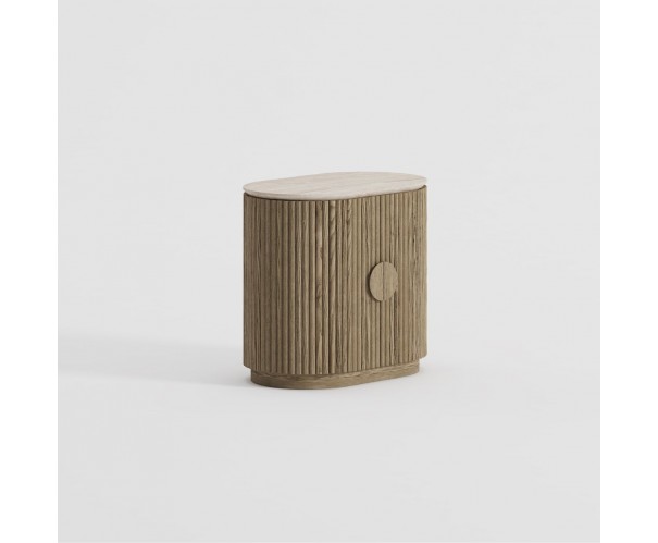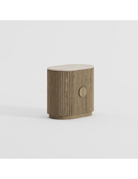 Mesita de noche con puertas, en palillería de fresno claro, combinada con un subre de travertino beig.