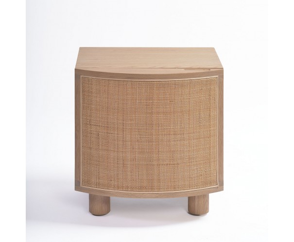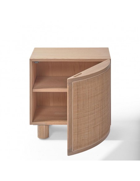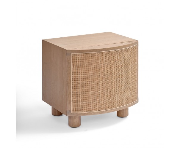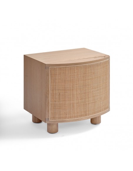 Mesita de noche en roble claro con puerta curva en ratán. Apertura izquierda de la puerta. Ideal para combinar con nuesto aparador VERONA-1.