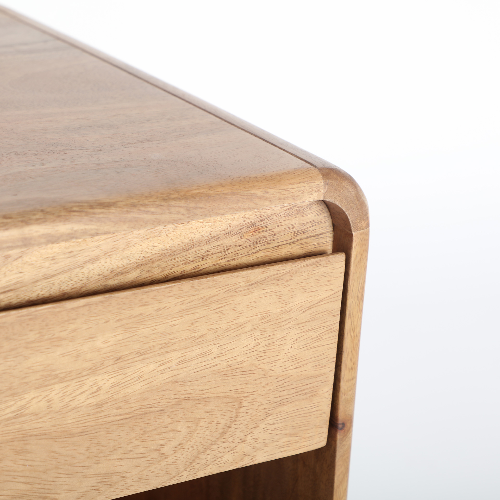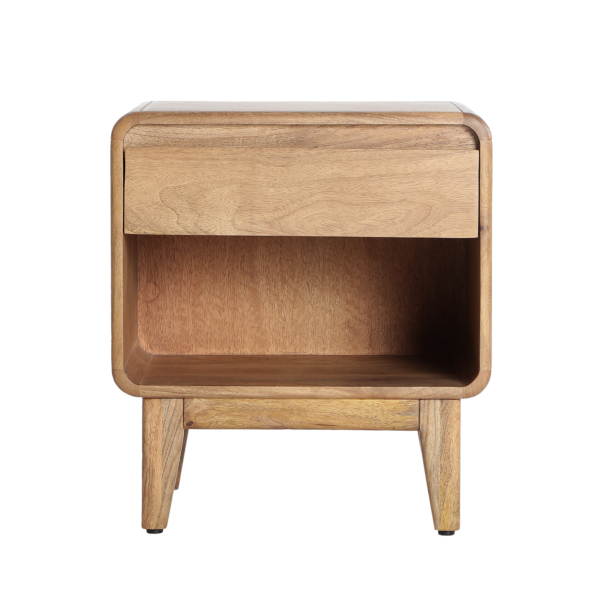 Mesita de noche Finhan de estilo nórdico, fabricado en madera de mango en color marrón, combinado con madera dm.