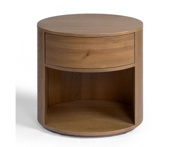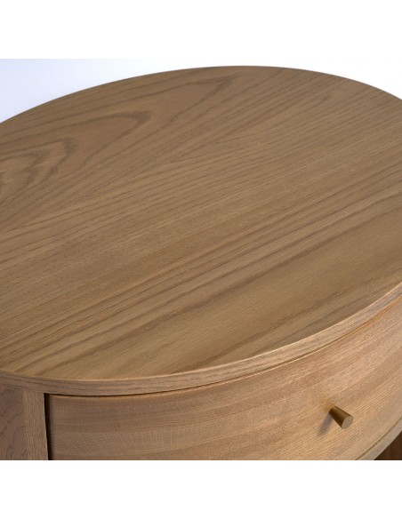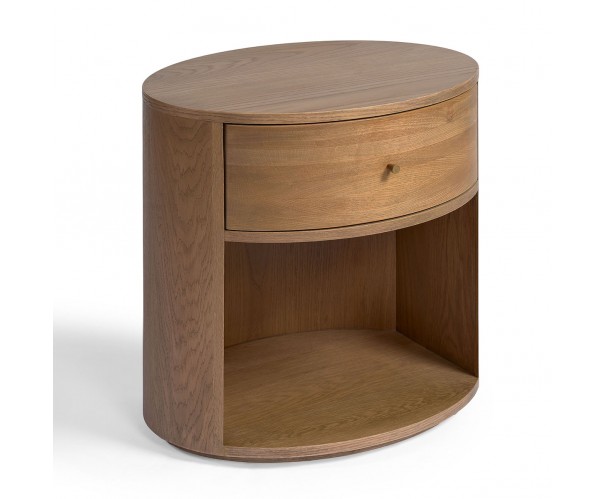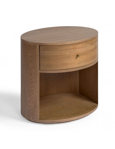 Añade un toque de sofisticación a tu dormitorio con nuestra mesita de noche de madera de roble natural, caracterizada por su estructura ovalada de estilo cilíndrico. Equipada con un cajón y un espacio abierto de almacenaje, esta pieza no solo ofrece funcionalidad, sino también un diseño elegante y contemporáneo. El tirador metálico complementa perfectamente el acabado de la madera, añadiendo un detalle moderno y práctico. Ideal para mantener tus elementos esenciales cerca durante la noche, esta mesita de noche combina belleza y utilidad para mejorar cualquier espacio con su presencia distintiva.