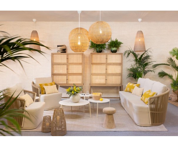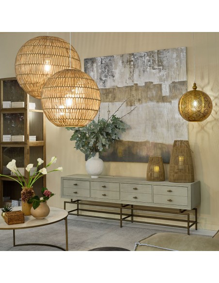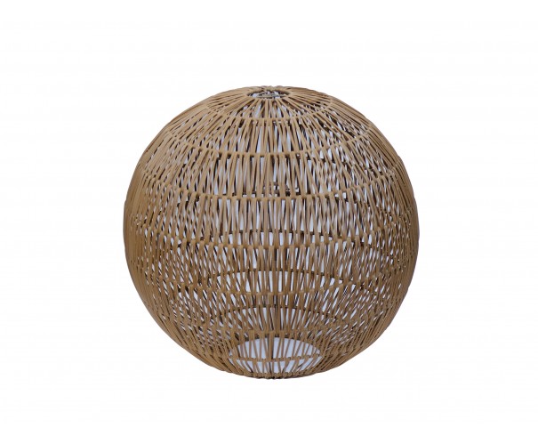 Pantalla de ratán sintético en color natural con forma redonda. No incluye bombilla ni casquillo. Sólo ve vende la pantalla.