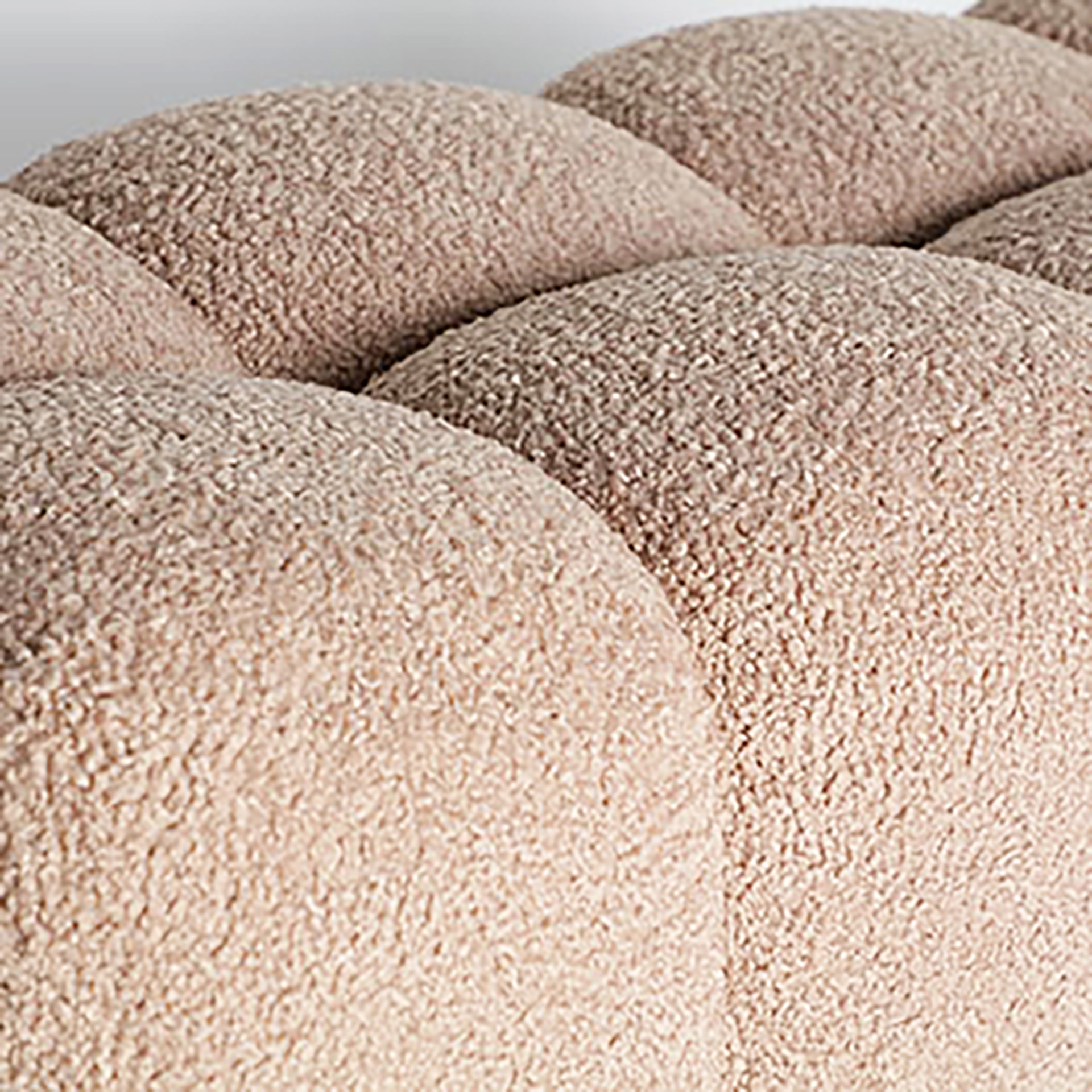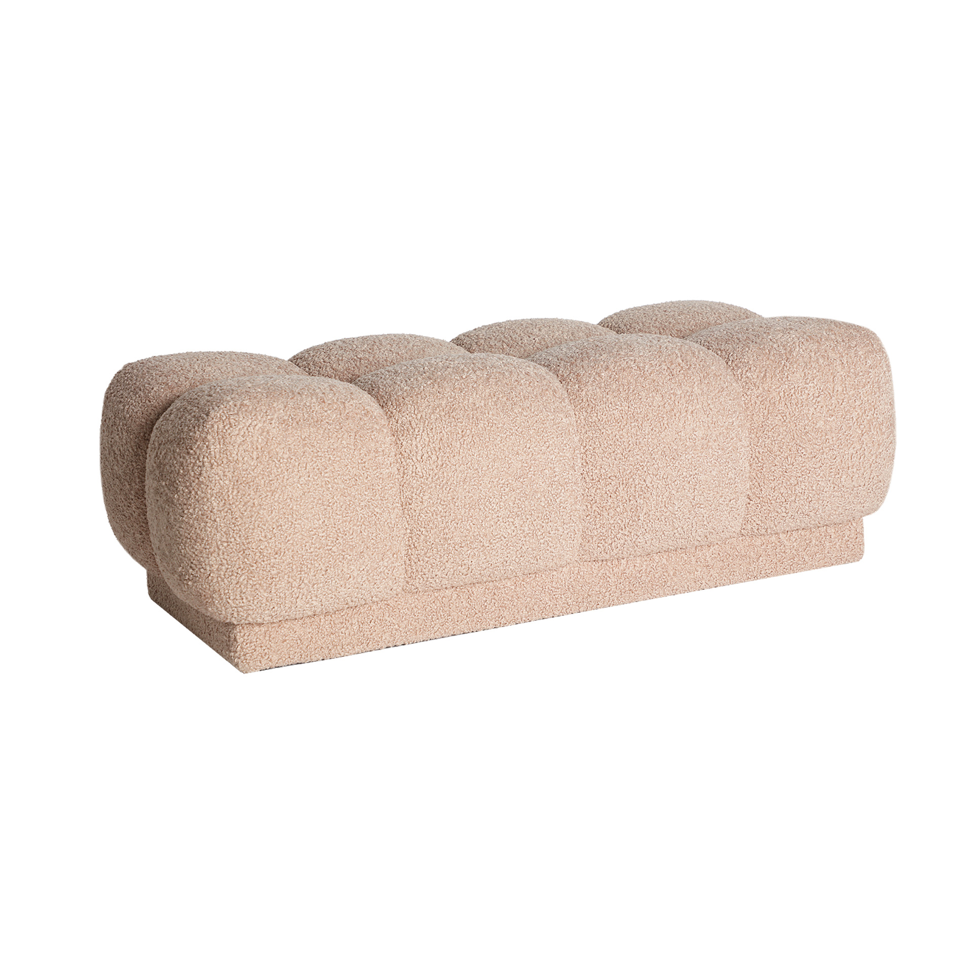 Pie de cama marburgo de estilo contemporáneo, fabricado en algodón bouclé en color marrón, combinado con madera contrachapada y espuma.