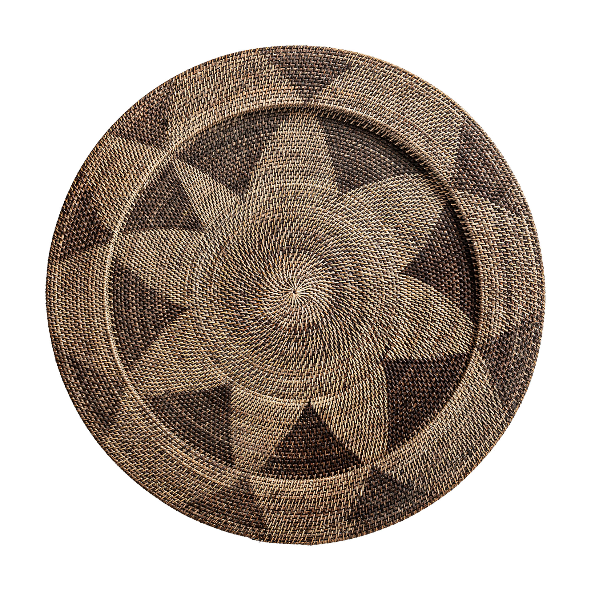 Plato decorativo de estilo boho fabricado en ratán en color tonos en marrón.