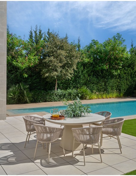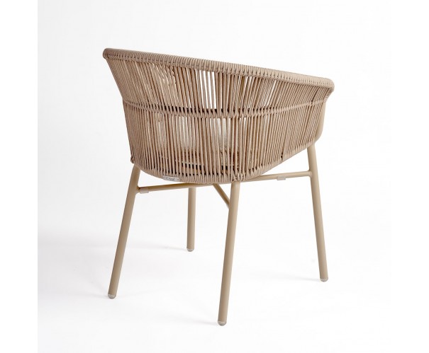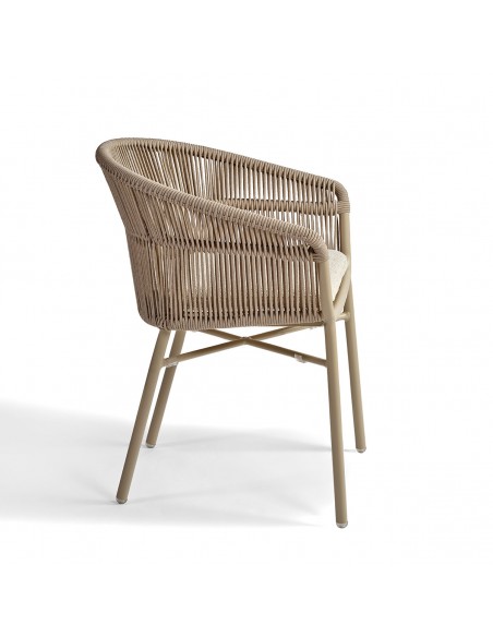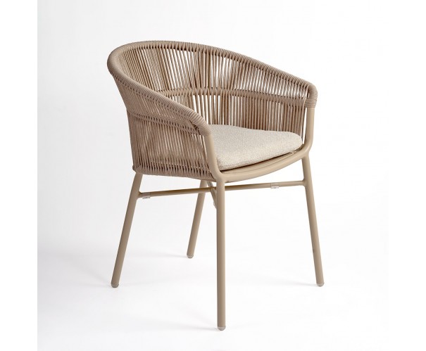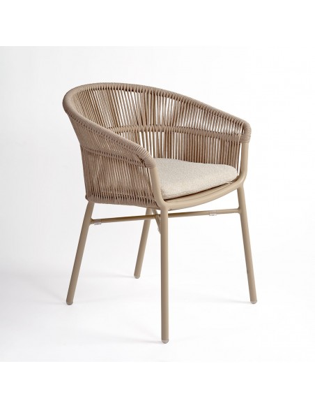 Sumérgete en la sofisticación al aire libre con nuestro nuevo sillón. Su estructura de cuerda, en un suave tono arena, combina a la perfección con el cojín tapizado, creando un conjunto elegante y acogedor. Ideal para terrazas y jardines, este sillón aporta un toque de lujo y versatilidad a cualquier espacio. Perfecto para proyectos que buscan la armonía entre naturaleza y diseño.
