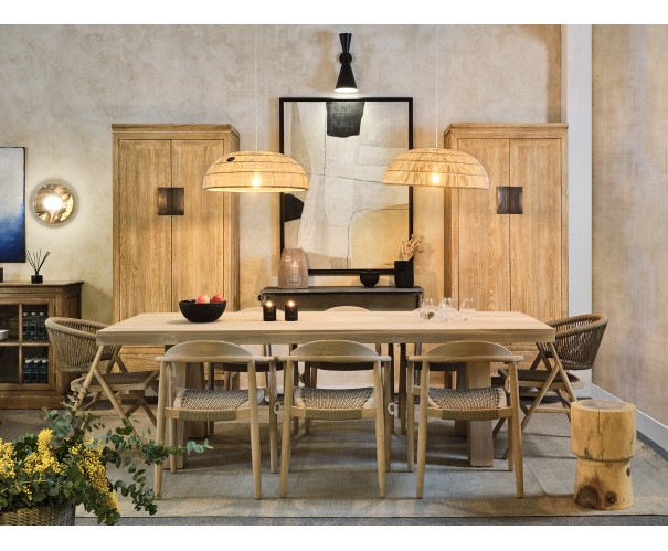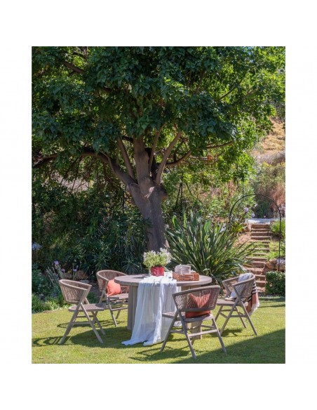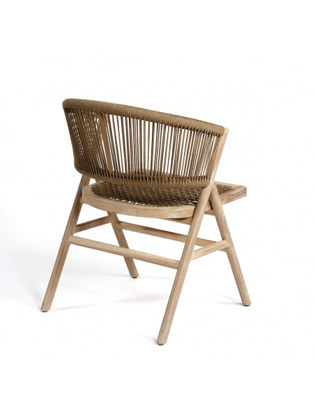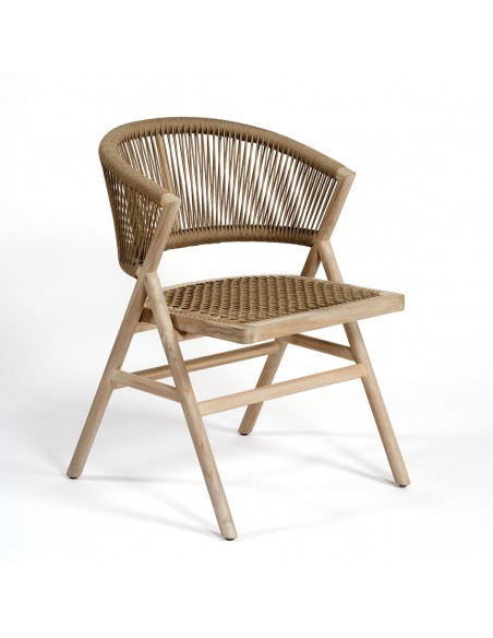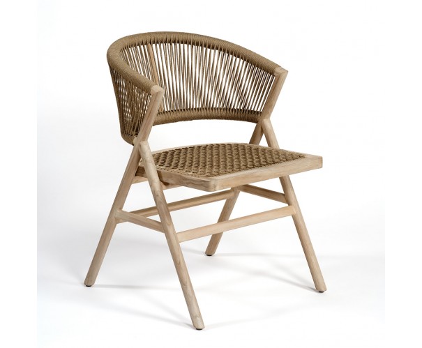 Silla de comedor de madera de teca blanqueada y cuerda en color camel. Un original diseño con el asiento de líneas rectas y el respaldo curvo que aporta mayor comodidad. Es apta para uso en exterior. Perfecta para ambientes de diseño de jardín o porche.