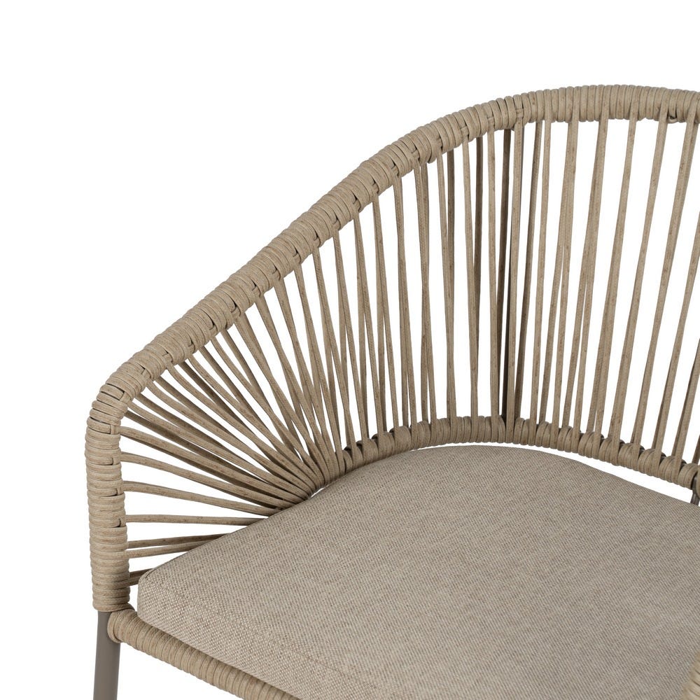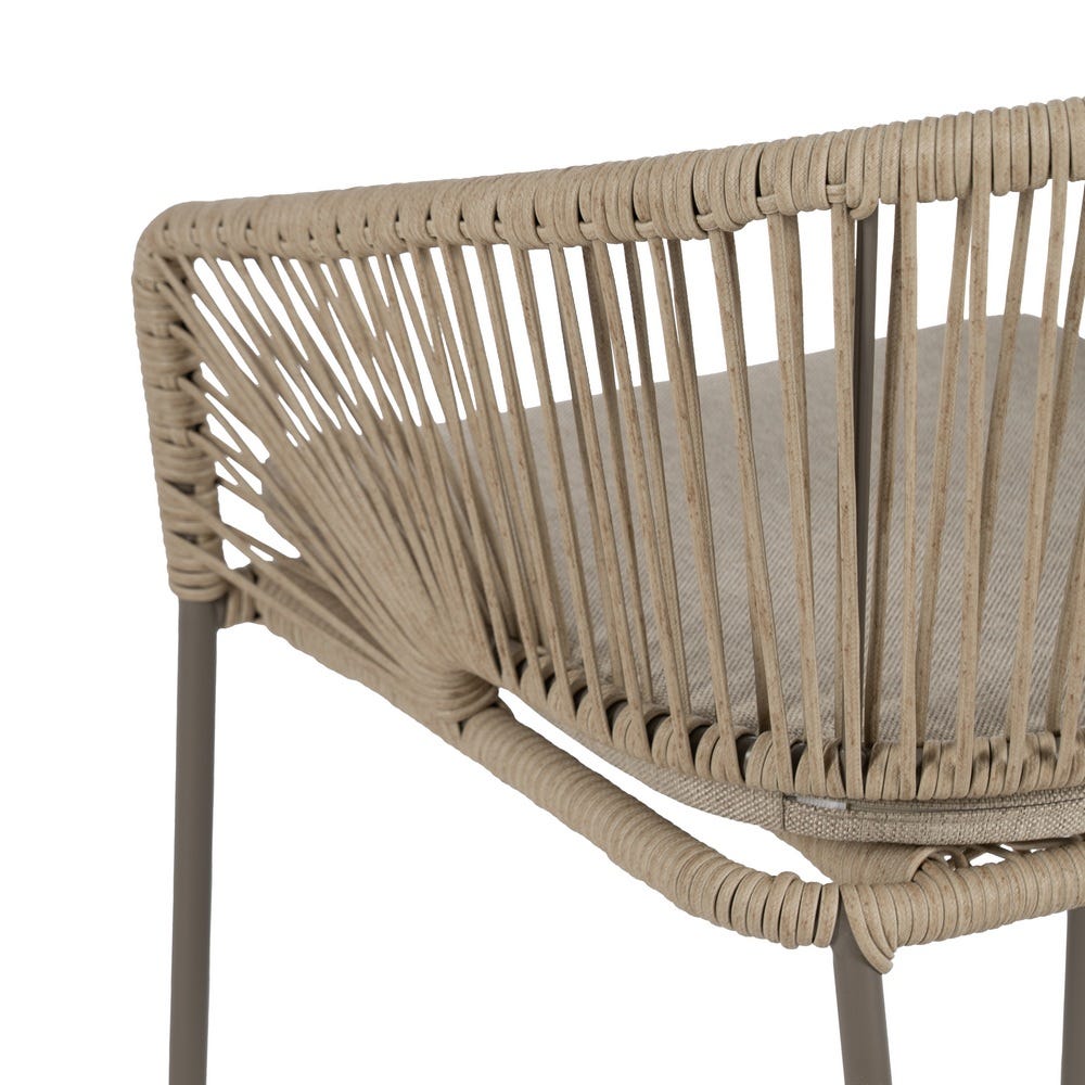 Material: polietileno, acero. Altura asiento: 50cm. Ancho asiento: 44cm. Profundidad asiento: 44cm. Altura respaldo: 33cm. Altura reposabrazos: 15/25cm. Cojín desenfundable. Cumple la normativa EN581 (uso exterior).