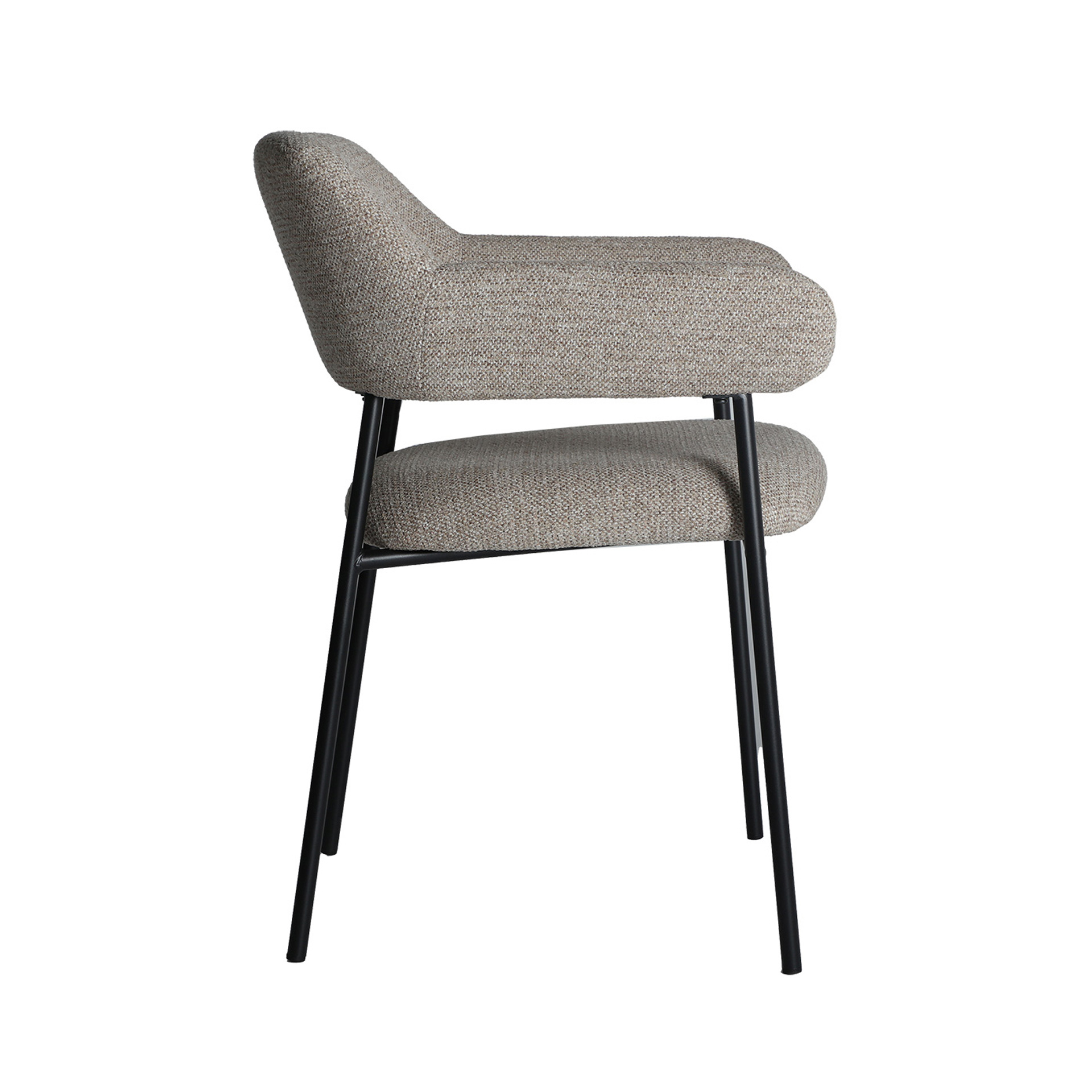 Silla Sarzay de estilo contemporáneo, fabricado en poliéster en color marrón claro con acabado jaspeado, combinado con hierro en color negro y madera dm. Producto desmontable.