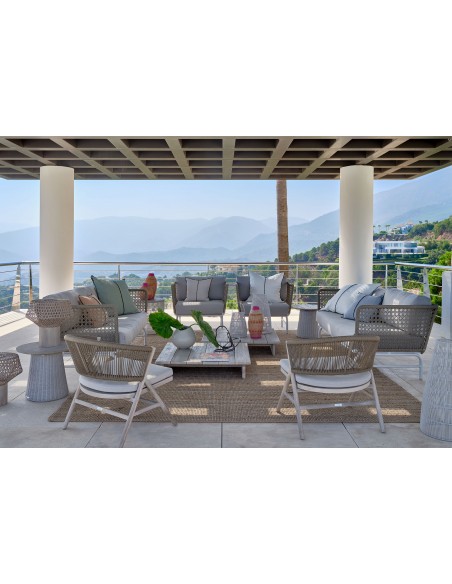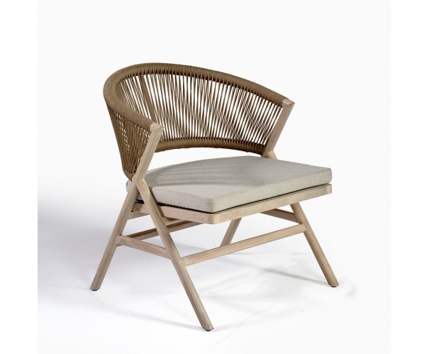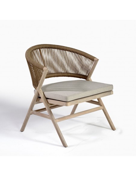 Sillón bajo de exterior de teca y cuerda camel