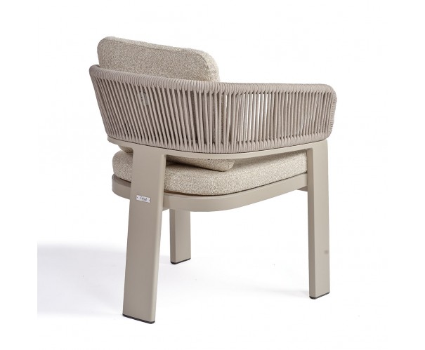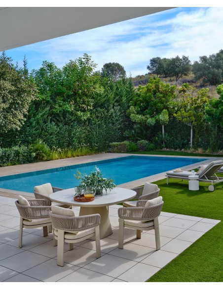Nuevo sillón de comedor de la colección JAMAICA, en color arena, un tributo a la elegancia y la artesanía. Con respaldo de cuerda en el mismo tono y exquisitamente tapizado en tela de alta calidad, este sillón combina sofisticación con un diseño versátil y lujoso. Ideal para ambientes de exterior, porches o comedores al aire libre llenos de elegacia. Este sillón refleja nuestro compromiso con la excelencia y la belleza en cada detalle. Disponible en otras versiones de la colección JAMAICA como sofás o sillón.