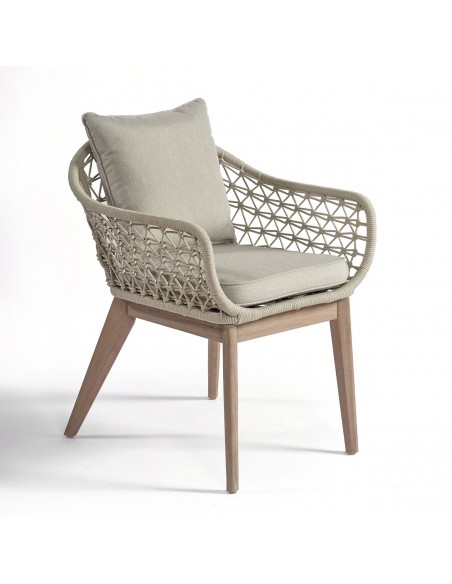 Sillón de comedor apto para exterior con pata de madera de eucalipto y estructura de asiento de cuerda sintética color blanco grisáceo. Este modelo cuenta con un cojín en el asiento que aportan mayor comodidad. También disponible en color cemento.