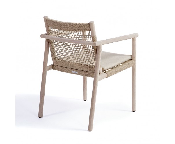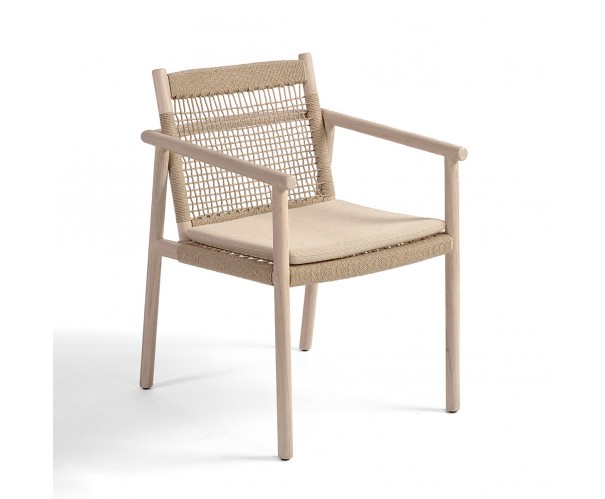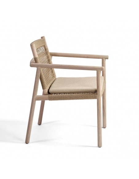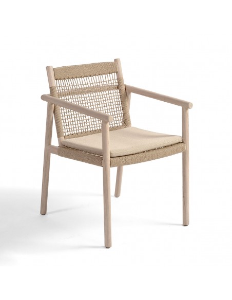 Sillon de comedor estructura de madera de teca envejecida y respaldo de cuerda. Cuenta con cojín en el asiento para mayor comodidad y pasar sobremesas distendidas al aire libre. También disponible en sillón bajo. Crea tu combinación perfecta para tu comedor de exterior o jardín.