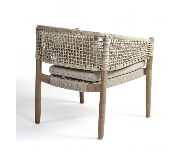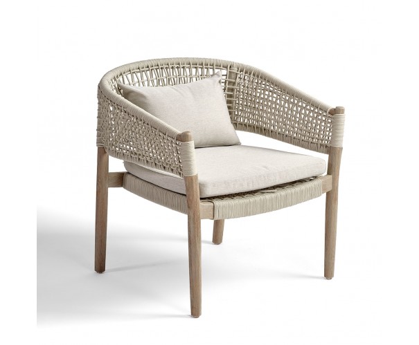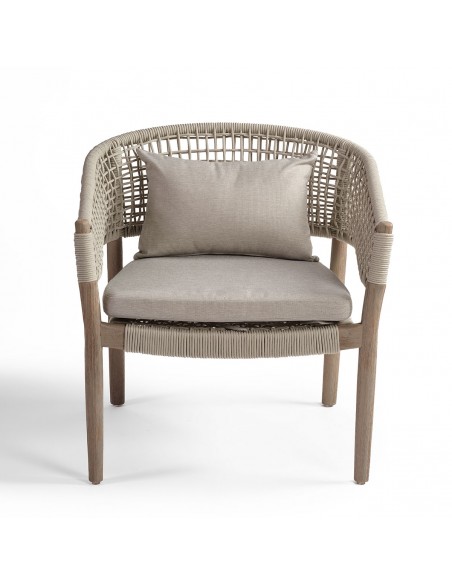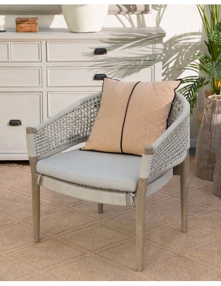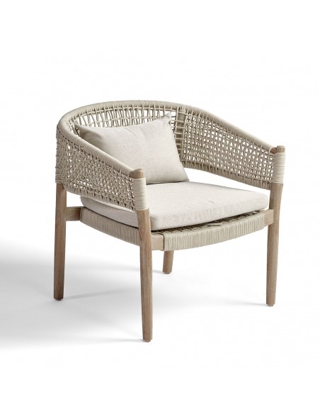 Sillón de exterior de madera y cuerda color blanco grisáceo. Este sillón es ideal para tu zona de jardín, terraza o porche como sillón individual de la zona chill-out. También disponible en color arena.