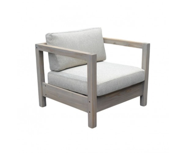 Sillón para exterior realizado con estrucutra de madera de teca blanqueada. Estructura y y respaldo de madera con cojines tapizados en color claro. Un sillón elegante ideal para crear tu combinación perfecta para un porche o jardín de ensueño con este sillón que no dejará indiferente a nadie. También disponible el sofá Claudia-1 para completar la colección.