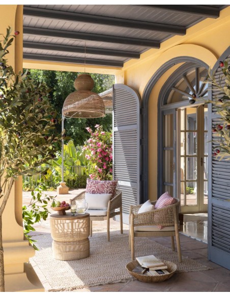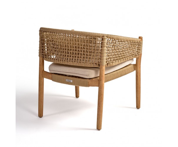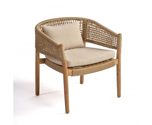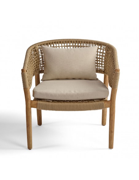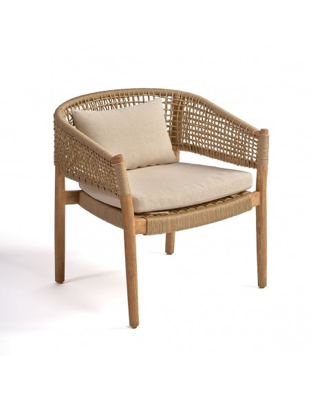 Sillón de exterior de madera y cuerda altura bajo para uso en zona chill. Fabricado en madera color natural y cuerda color arena. Sus materiales lo hacen una pieza cálida y acogedora para tu zona de estar, jardín o porche. También disponible en blanco grisáceo.