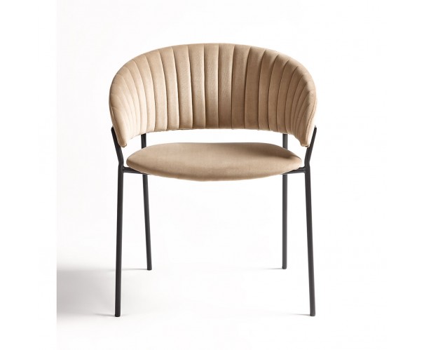 Sillón de terciopelo en color beige con respaldo curvo y estructura metálica negra. Sus materiales la hacen una pieza ligera y muy versátil gracias al color de su tapicería. Aportará luminosidad y ligereza a tu ambiente.