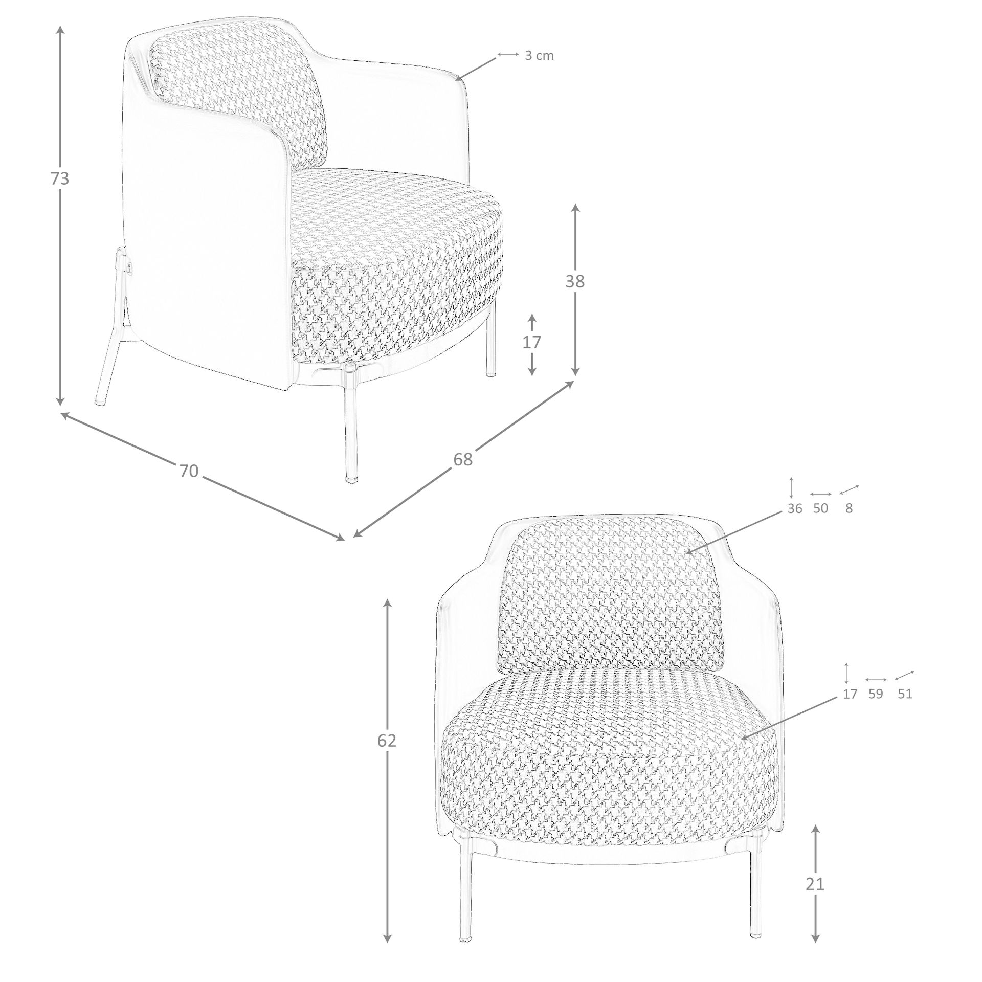 Sillón tela blanca y negra y polipiel negro modelo 5139 Angel Cerdá S.L.Sillón con reposabrazos de diseño moderno con asiento tapizado en tela color blanca y negra y respaldo tapizado en polipiel color negro. Tanto por su estilo, como por sus patas de acero inoxidable pulido oscurecido, este sillón es la combinación perfecta entre diseño y confort.Medidas del producto: 68 x 70 x 73 cm.- La combinación de su tapizado en tela y polipiel, le confiere el toque diferente, exclusivo y original que busca para crear ambientes repletos de estilo. – Sus patas robustas y de carácter lineal permite combinarla con cualquier pieza de nuestra colección de muebles de diseño. – Tanto por el tamaño de su asiento y su relleno en espuma de poliuretano de 25kg/m3, así como su cómodo respaldo le permitirá contar con el máximo confort, sin dejar de lado el diseño más actual. – El cojín del respaldo es extraíble, desenfundable con sistema de cremallera y lavable.