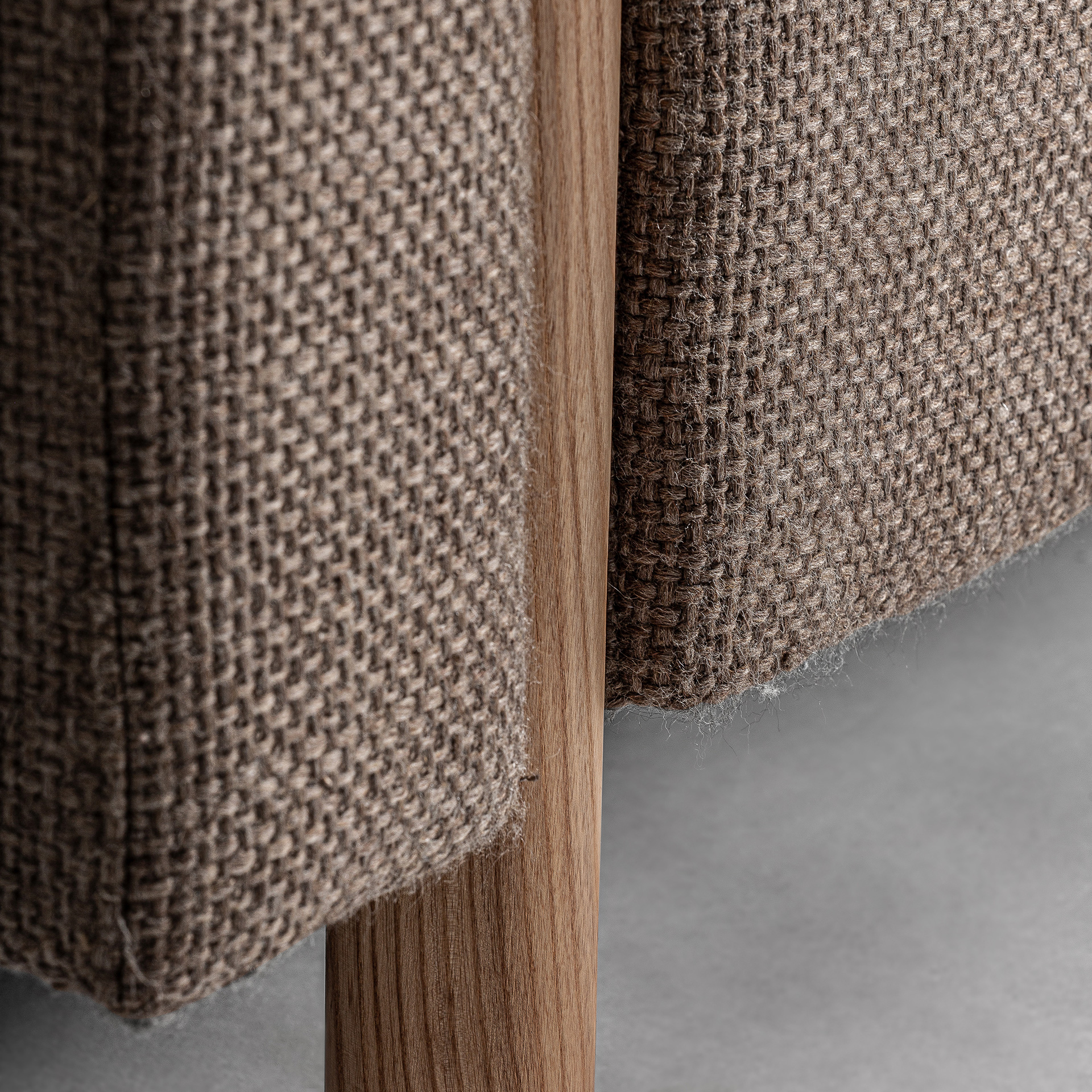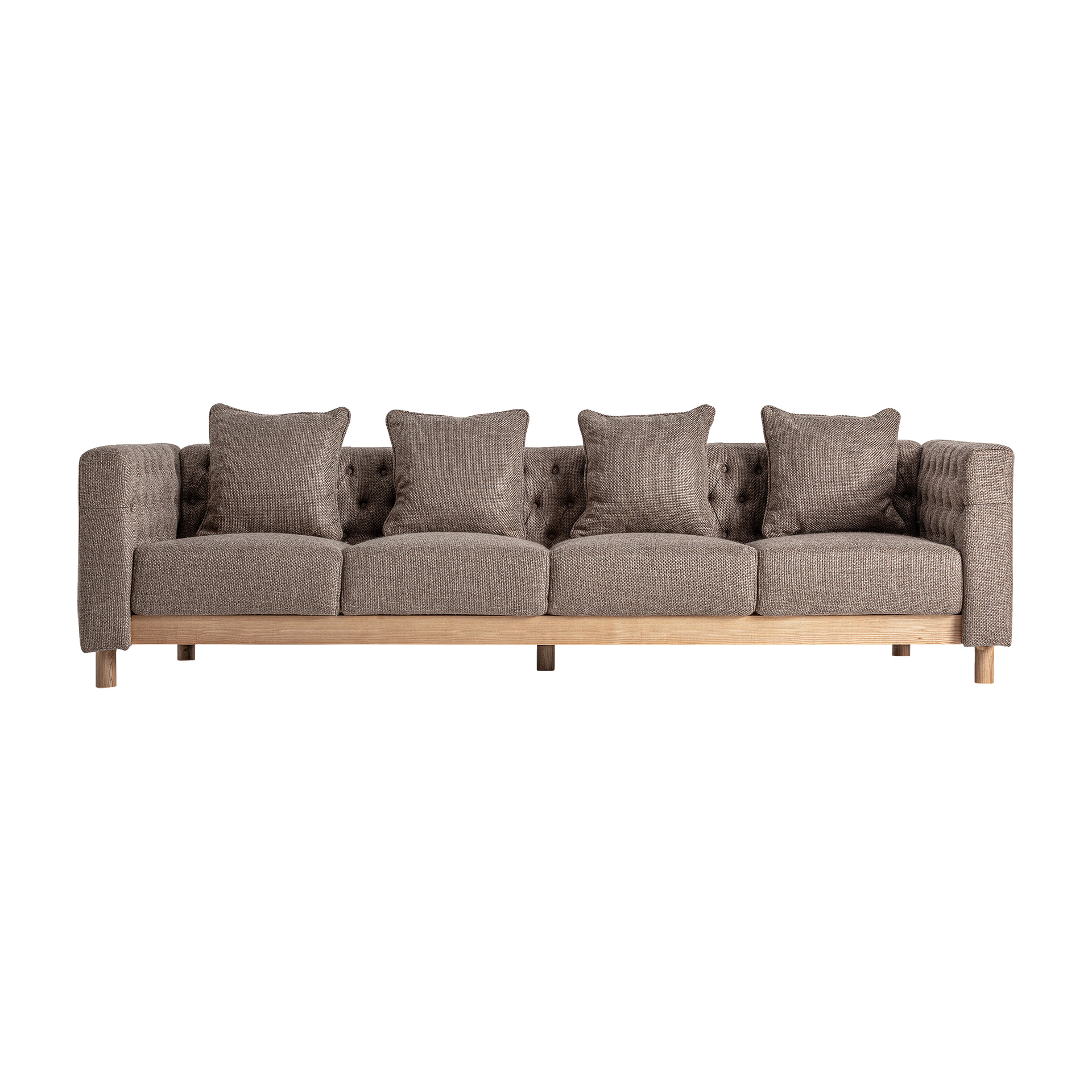 Sofá Carlton de estilo colonial fabricado en poliéster en color beige con acabado jaspeado combinado con madera de pino en color marrón claro y espuma. Producto desenfundable.