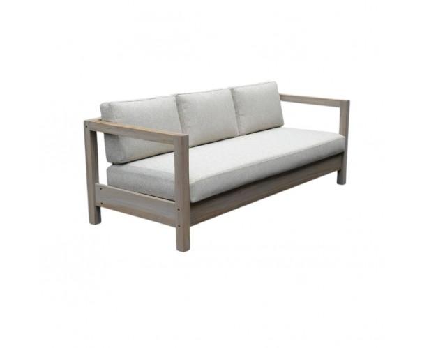 Sofá para exterior realizado con estrucutra de madera de teca blanqueada. Estructura y y respaldo de madera con cojines tapizados en color claro. Un sofá elegante ideal para crear tu combinación perfecta para un porche o jardín de ensueño con este sillón que no dejará indiferente a nadie. También disponible el sillón Claudia para completar la colección.